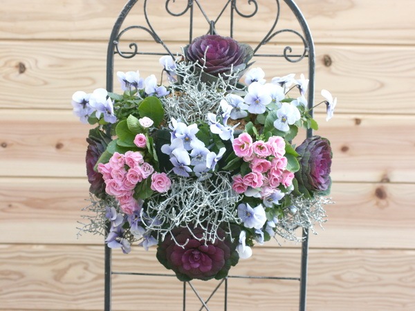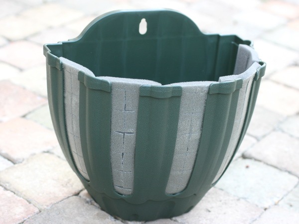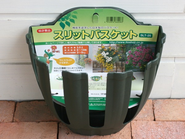 ラティスやフェンス、ブロック塀、ベランダの手すりなど空中の壁面に花を飾ることのできるプラスチック製のハンギングバスケット、専用容器です。 もともと「ハンギングバスケット」というのは、「引っ掛ける容器」という意味ですので、上部のみに植え込む容器もハンギングバスケットです。 このバスケットの特長は、苗を横向けにして側面に植え込む手法のためにできた商品です。 スリット、つまり植え込み口は5箇所かり、その部分に付属のスポンジを貼ります。 両面テープがついていますので、簡単に貼り付けることができます。 植え方の説明が本体についていますので、どなたでも簡単に植え込みことが可能です。 なお、植えこむ植物の苗数ですが、最初はバスケットが見えていてもかまわず、ゆっくり大きく育てられる方は、7株でも大丈夫です。 でも、最近は植えた瞬間から豪華、飾ってきれいなハンギングや寄せ植えが人気です。 お好みで楽しんでくださいね。 なお、使用例の写真は、当店でベゴニアのみで作成した単品のハンギングバスケットです。 初夏の場合、植え込んで約2週間で左側の状態、そして1ヶ月後には右のような状態になります。 もちろん、いろいろな植物を寄せ植えのようにミックスで植えるの楽しいですよ。 |