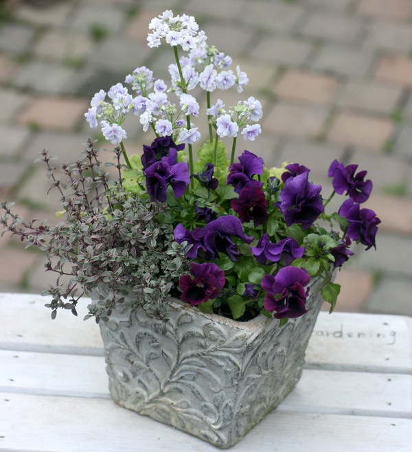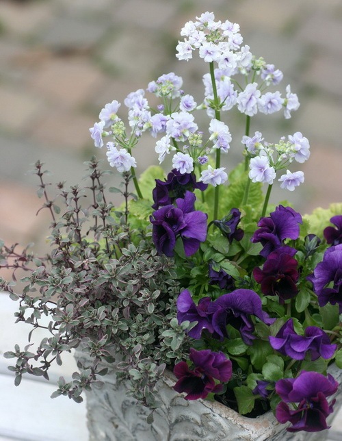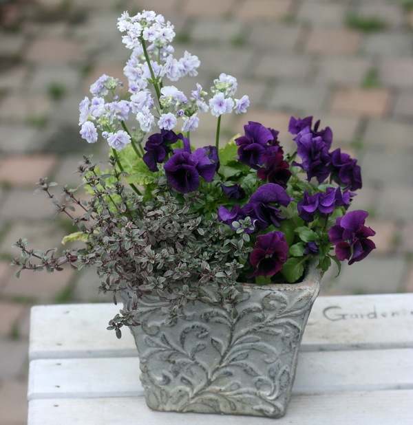 この寄せ植えの魅力は、気品のある大人の配色ですね。
