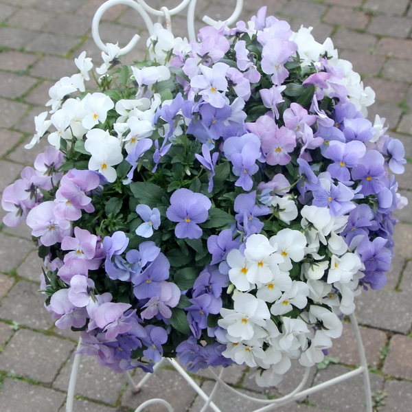葉物やいろんな花を混ぜ込んだバスケットも素敵ですが、過去の風散歩のハンギングバスケット作品画像を見渡すと、ビオラのみのミックスカラーも意外といいんですよね~(←自画自賛モード)