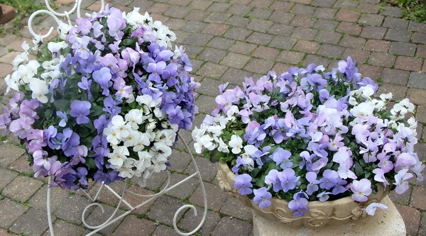 パンジービオラのハンギングバスケットは、例年、暖地の大阪でも5月頃まで楽しんでいただいています。