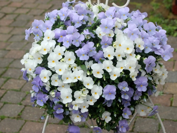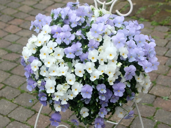 パンジービオラのハンギングバスケットは、例年、暖地の大阪でも5月頃まで楽しんでいただいています。