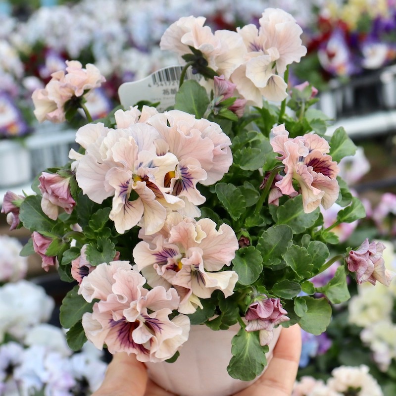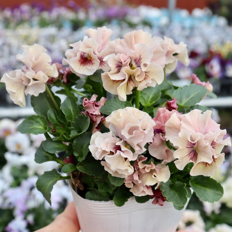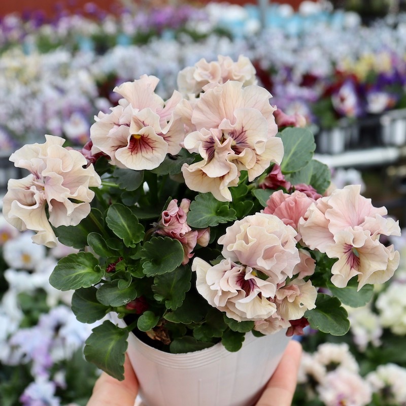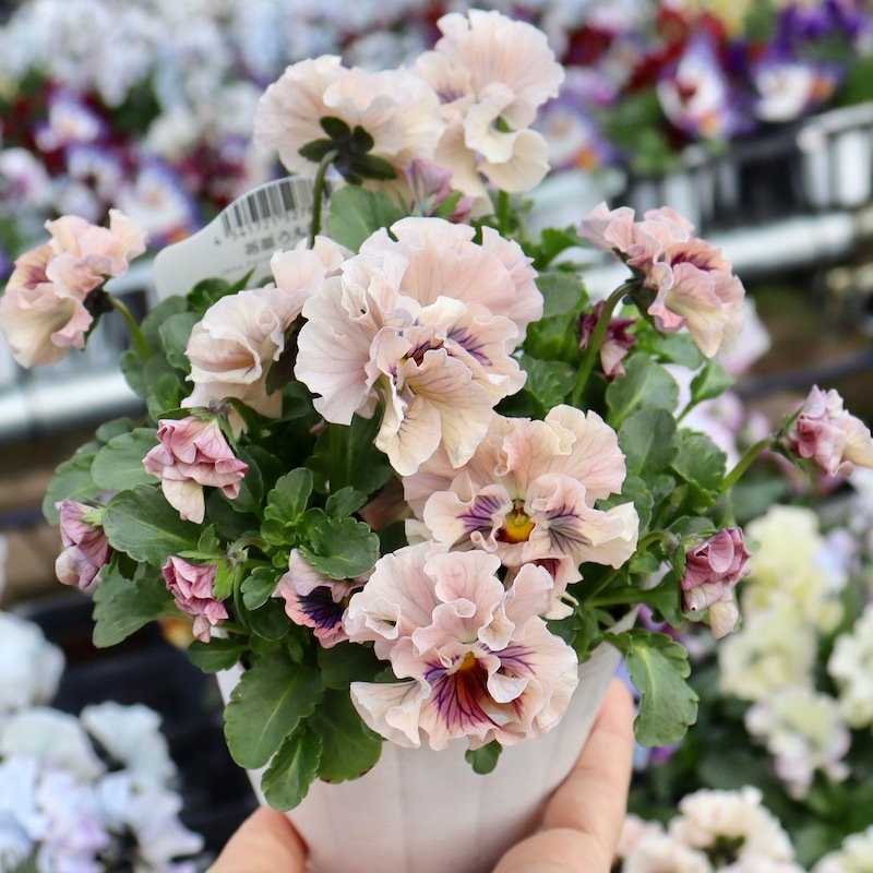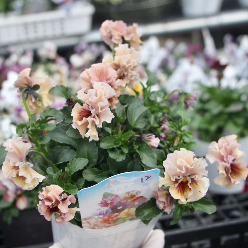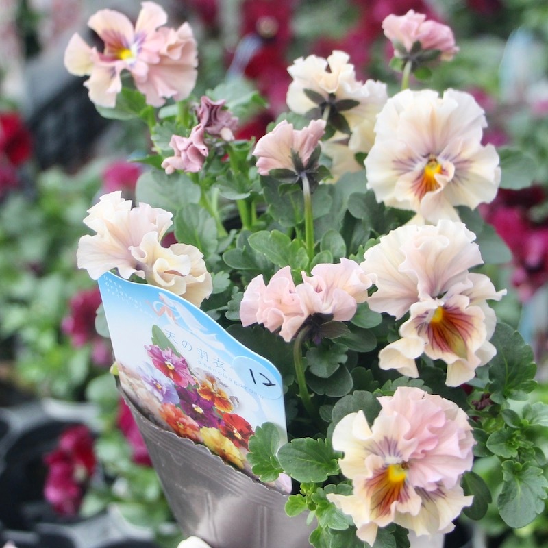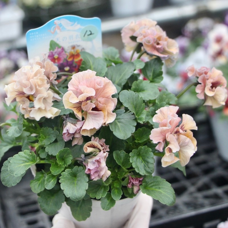 最新の入荷株の状態は動画でご覧頂けます♪ もうしばらくお待ちくださいね。 ************************* 毎年大好評♪ 毎年進化している 高知・うえたさんの フリル咲きミニパンジー「天の羽衣」