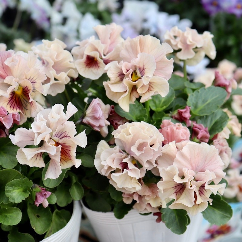 高知の植田さんの長年大人気のフリル咲きミニパンジー「天の羽衣」 例年通り、細かすぎる色分けをしていますので、今後開花が進むと花色が変わってくるものもあります。現在の花色での色分けです。あらかじめご了承ください。