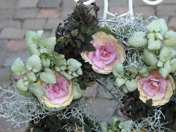 スリットバスケットで作る壁掛けハンギングにないセールスポイントです。 横から見るより上から見る方がきれいですので、少し低めの台がいいですね。 葉牡丹もカラーリーフも日陰にも強く、「冬は日が短くどうしても日照不足で花が咲きにくい」とお困りのところでも楽しんでいただけます。 そういう条件下でも楽しんでいただけるリース。