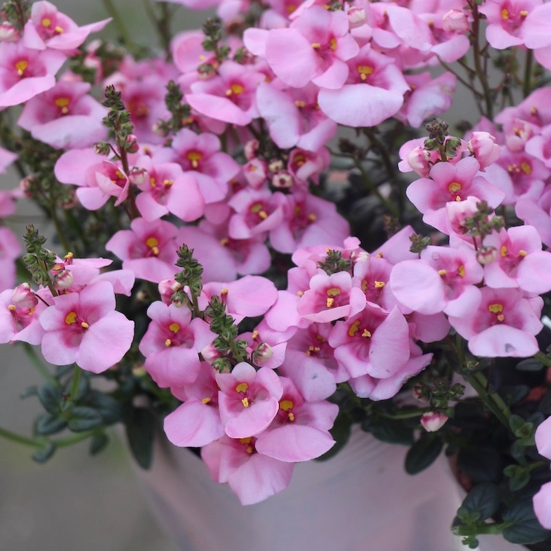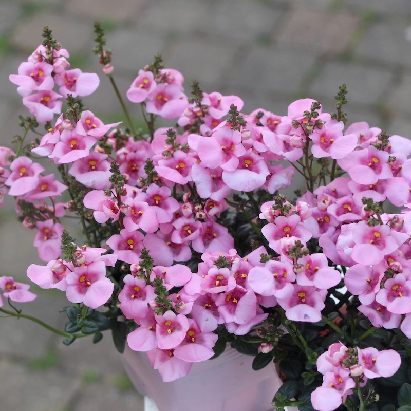 「ディアスシア(宿根草)」というのは、 まっすぐに直立するのではなく、少し暴れるように育つ草姿が素敵な花。これから小花が次々と途切れずに咲きます。風が吹くと揺れる、その姿も可愛いです。 籠やウッドボックスなどのナチュラル素材との相性も抜群です。 こちら大阪(暖地)の場合は、例年1月はじめ頃まで咲き続け、真冬には一度開花はとまりますが、耐寒性はとても強く冬の間に株が育ち、早春から再び溢れるように咲き始めます。 しかも夏越しも容易です。 植えっぱなしで毎年楽しんでいただける嬉しい丈夫な宿根草(多年草)です。