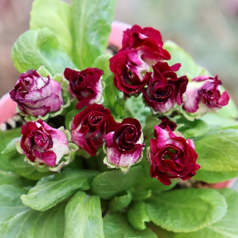 色幅があり過ぎて色分け困難な品種ですが^^; とりあえず過去画像と睨めっこして品番をつけました♪ 早春の代表的な花の一つ「プリムラ・ジュリアン」ですが、その中でも特に立体感のある花が人気の「バラ咲きタイプ」です。