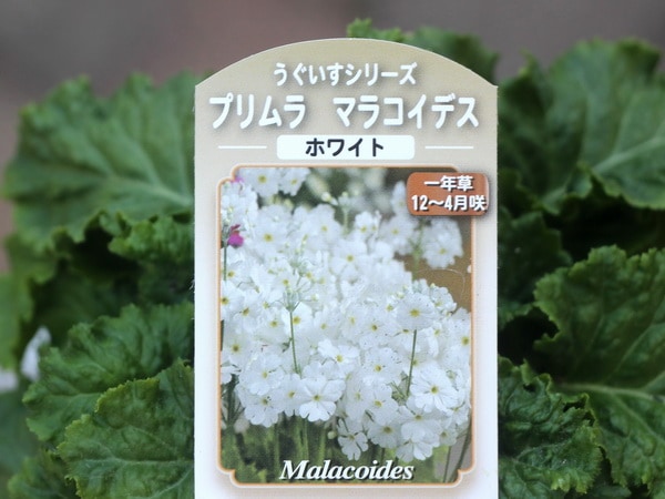 同様のことで、11月頃から12月頃にかけて「プリムラ・マラコイデス」というラベルのついた開花した鉢物(たまに苗もあります)がたくさん流通しますが、それらとは一見同じ名前がついていて同じような花でも全くの別物です。ご注意ください! 年内に豪華に咲いた開花株が売っていても、それを戸外に植え付けると傷みます。霜除け下でも傷みます。 それらの開花株は暖かい室内の窓辺を飾る冬の花なのです。 (私はおすすめしませんが・・・苦笑)