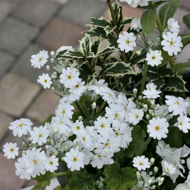 一番寒い2月、パンジーなども一時花が休む寂しい季節にどんどん花を咲かせ、3月頃から4月下旬頃まで道行く人が思わず立ち止まるほど豪華に咲き誇ります。(開花期は地域、栽培条件によって異なります) 春の開花を見て「あの花が欲しいのですが・・・」と問い合わせを受けることが多いですが、開花株はオススメできません。 また、一見同じ「マラコイデス」というラベルのついた苗であっても、生産農家さんが異なる苗を仕入れた時、不思議と耐寒性に欠けたものもありました。 実際にそのような苗も例年たくさん出回っていますので、気をつけてくださいね。(実体験の話です)