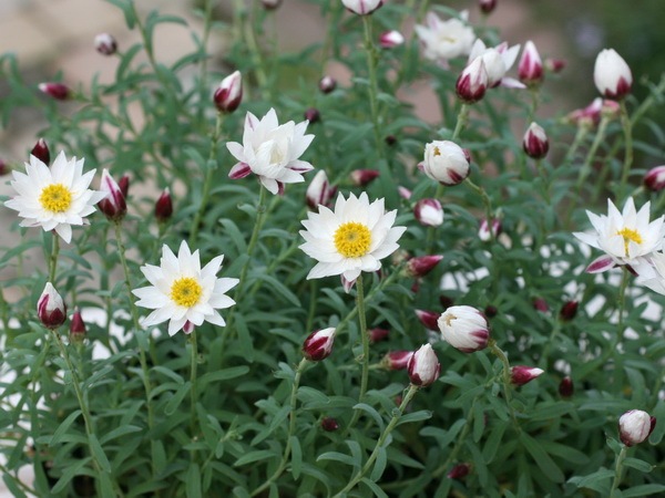 オーストラリア原産の多年草。 この蕾だけでもとってもキュートで可愛いんですが、開花すると白い花が咲いてぱっと華やかに。 花芯は黄色で紙のようなカサカサした白い花はドライフラワーのようでとっても爽やかです。 蕾の名残のように花の先端が気持ちだけ紅いのも可愛いし、花と蕾が混じった様子も紅白で可愛いんですよ。 花径は約2cmの小花。 ふんわり広がって下がる下垂性タイプですので、ハンギングや寄せ植えの前方にもオススメです。 (同様の花でもこんもりタイプと2種類あります)