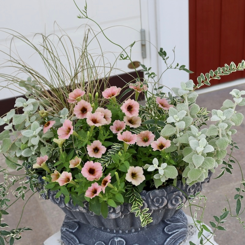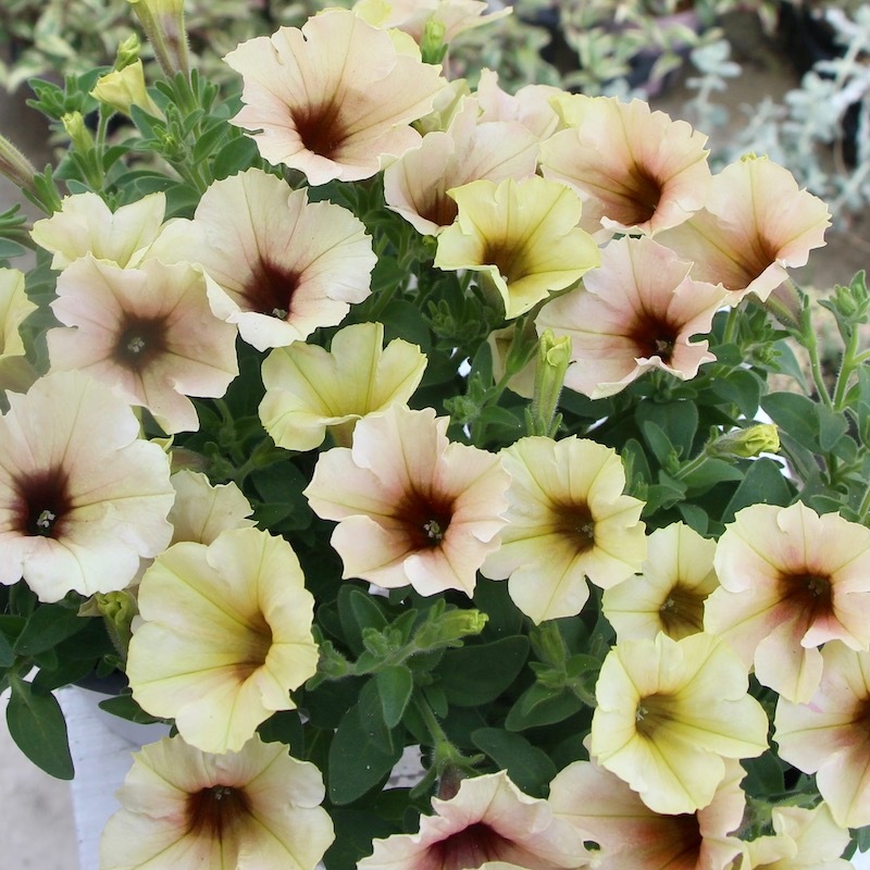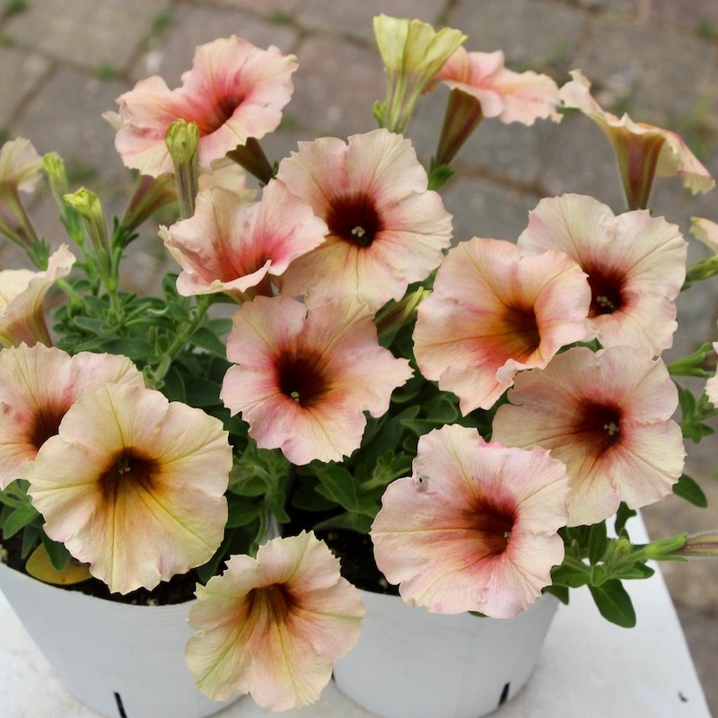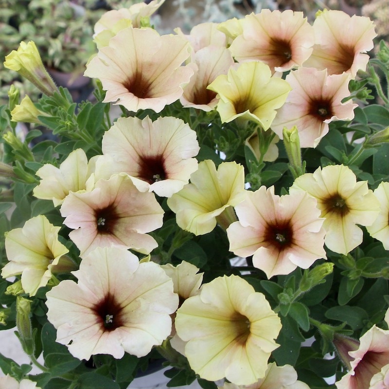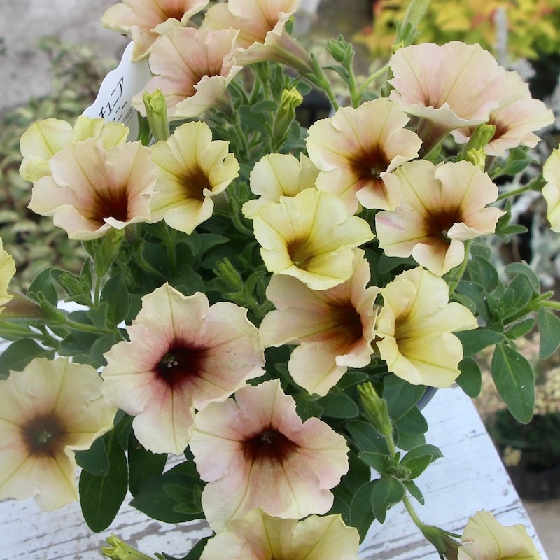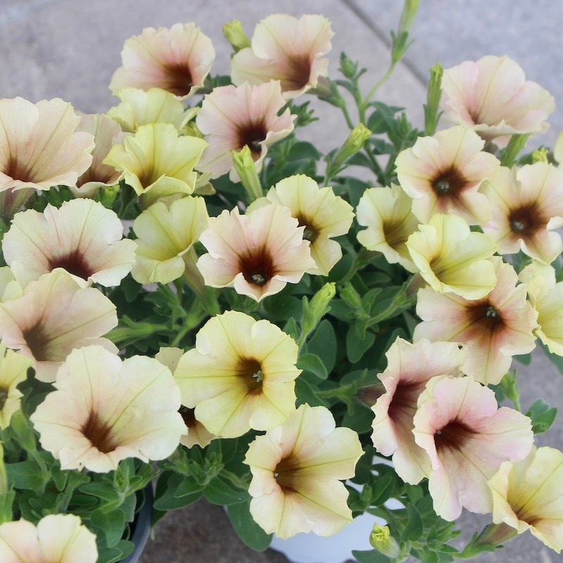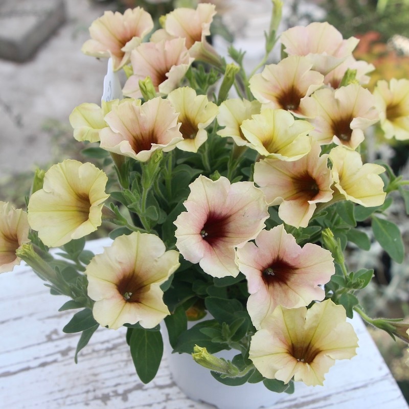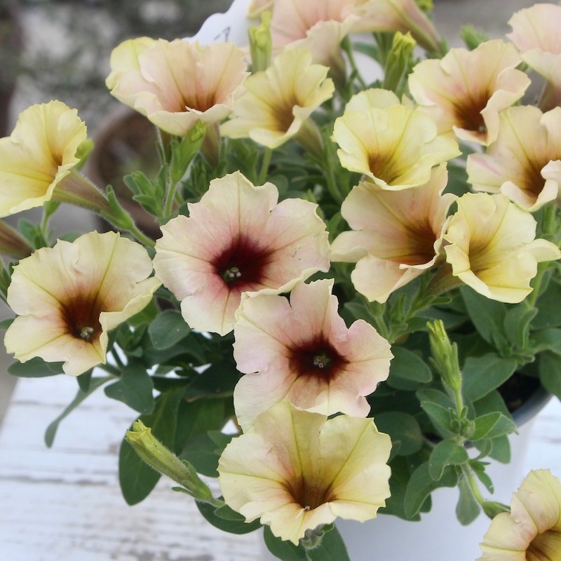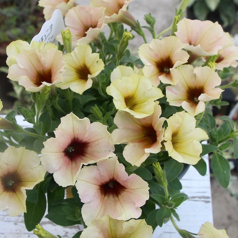 この画像ではイエロー系とアプリコット系が半々にも見えますが、この撮影翌日にはもっとアプリコット系が多くなりました。 優しく淡いパステルアプリコットの花になっていくことでしょう。 これからどんどん生育が早くなりますので、伸びた枝先をピンチ(剪定)しながら育てていただくと、いつまでも美しい草姿を保つことができます。