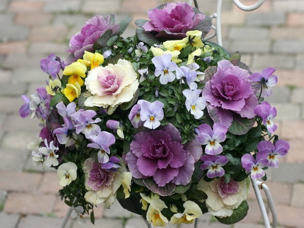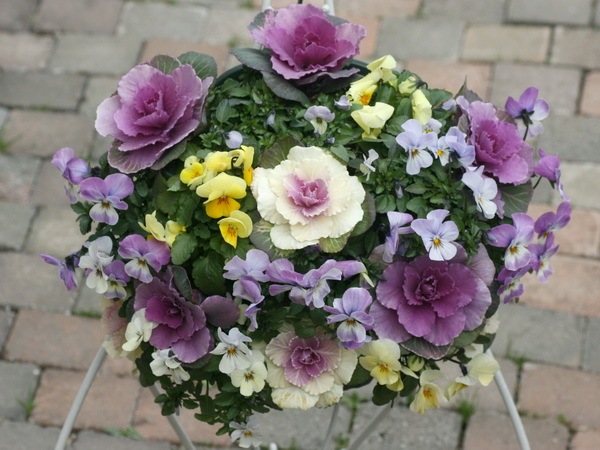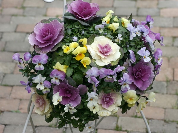 葉牡丹とビオラなどの草花ミックスで作成するハンギングは、季節によって2つの顔で楽しんでいただけ魅力があります。