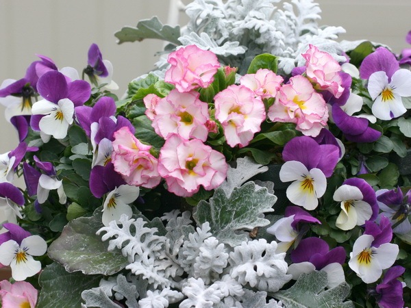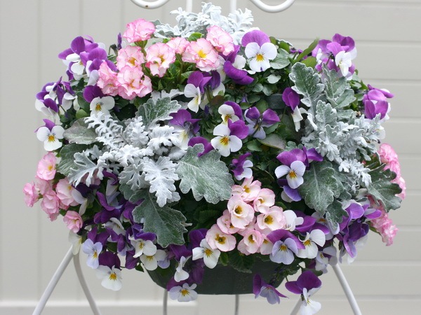 このハンギングバスケット「バラ咲きジュリアン&ビオラ」は、色あわせがポイント★