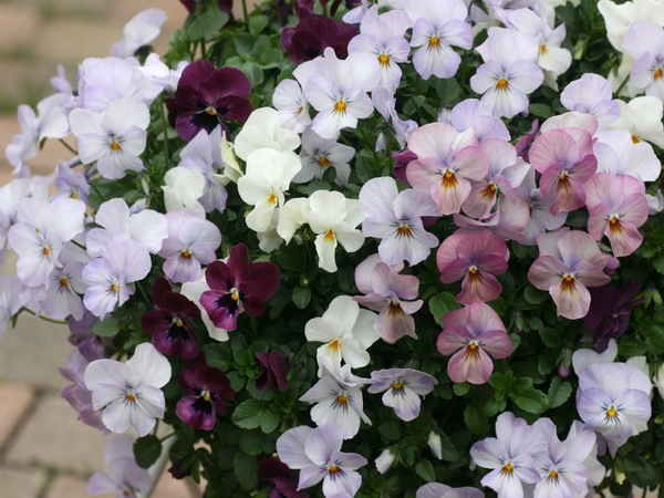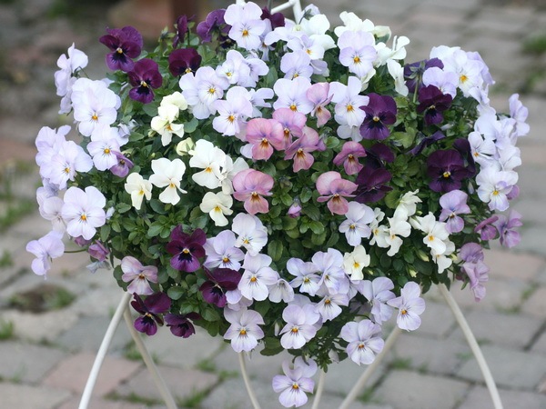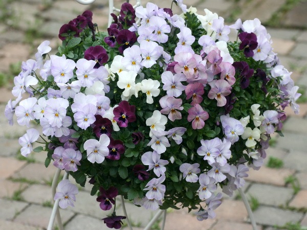 現品1点限りです♪ このハンギングバスケット「ラズベリーミックス」は、ホワイトからラズベリーカラーのビオラ4種をミックス! しっかりした良株ばかりで植え込み、日光と肥料でしっかりと育ててまいりました。 植え込み直後は隙間も多く、花もまだポツポツしか咲いていませんでした。 そして、一時開花を休む株の充実期を経て、今やっと、すべての株が開花し始めました。 ぎゅっと引き締まった株でありながら揃って咲いています。 もちろん、今はまだ蕾でいっぱい★