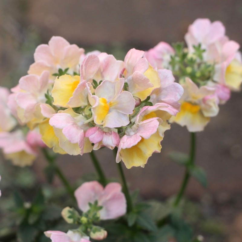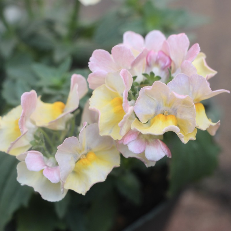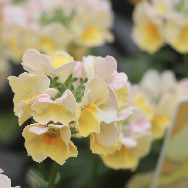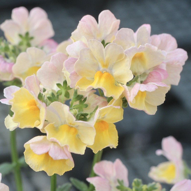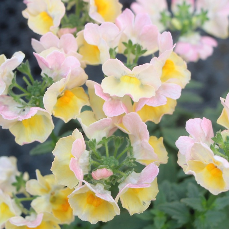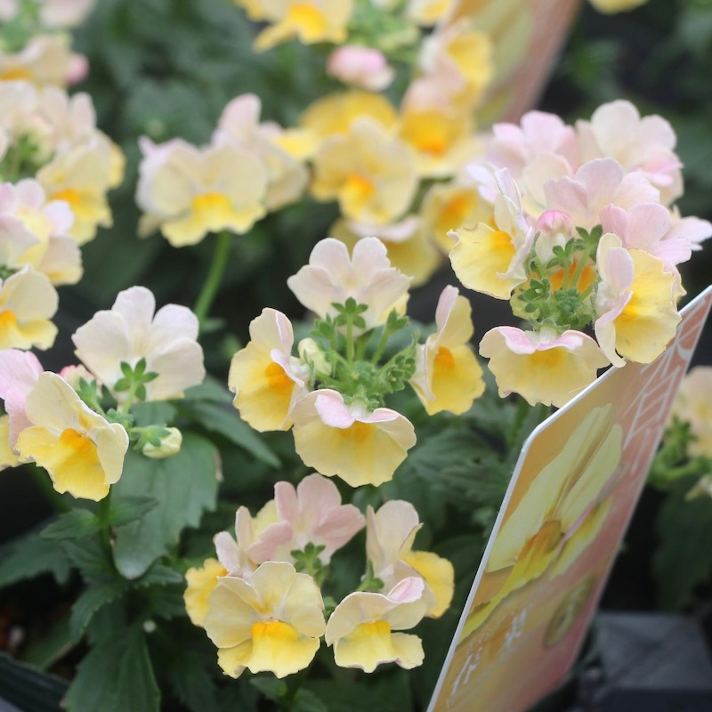 また花弁の裏側がほんのりピンクなので、単色で植えても優しい2色が混ざって素敵です。 気温によってはピンクが強く出たり、黄色が強く出たりと変化します。 また、ほんのりブルーがのってくることも。 「宿根ネメシア」といのは、耐寒性のある四季咲きの多年草。 花弁の形も個性的で素敵♪ 花径は大きいもので2cmぐらいありますが、基本的に小花。 毎年、春~初夏と秋に開花最盛期を迎え、あふれるようにふんわりと咲き続けます。 風になびく姿もまた素敵ですね。 決して派手な花ではありませんが、優しく可憐・・・そして豪華に。 単品で植えても見ごたえがありますが、寄せ植えにしても他の花ともうまく調和します。 特に、ナチュラルな雰囲気の寄せ植えにおすすめ! ウッドプランターや蔓籠などに植えてみてくださいね~。 もちろん、コンテナ、ハンギング、花壇、どこでも楽しんでいただけます。