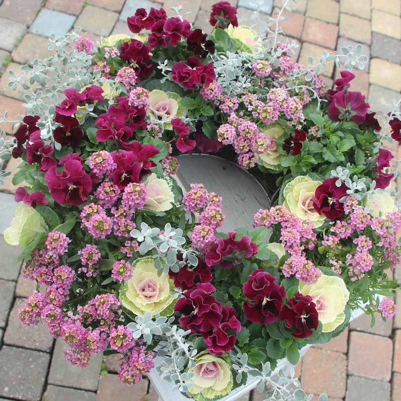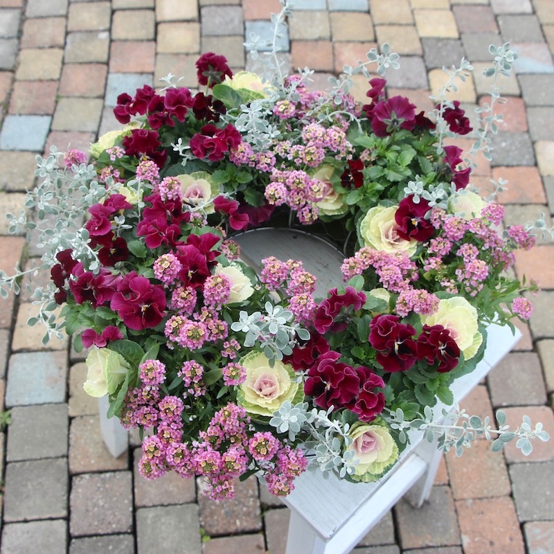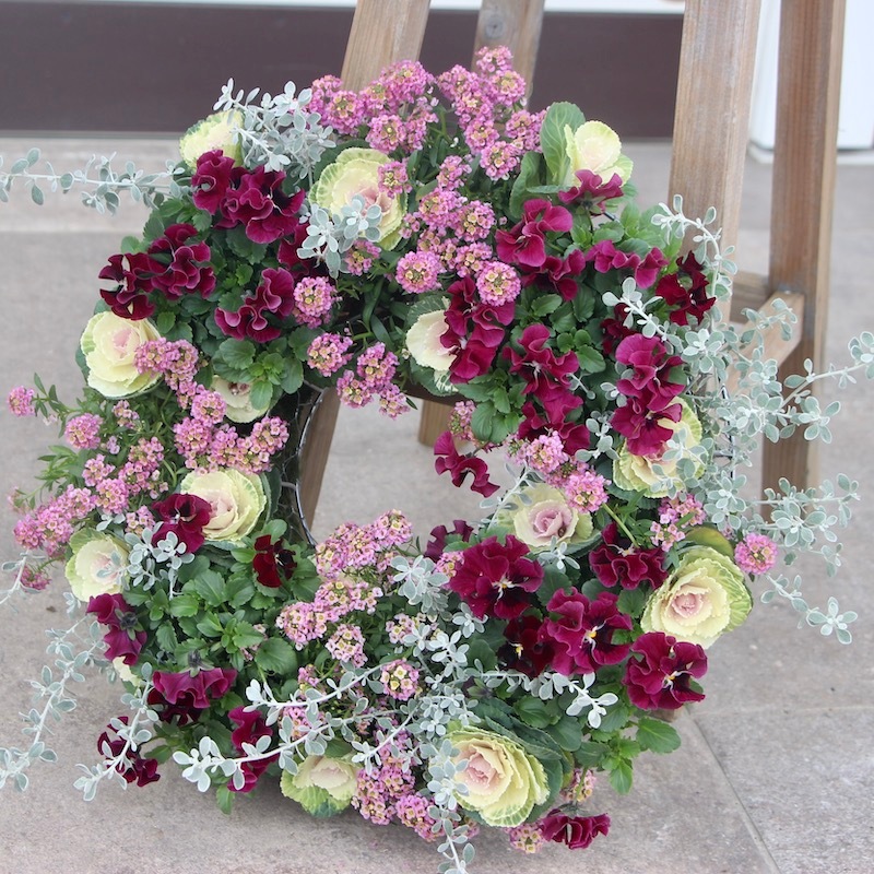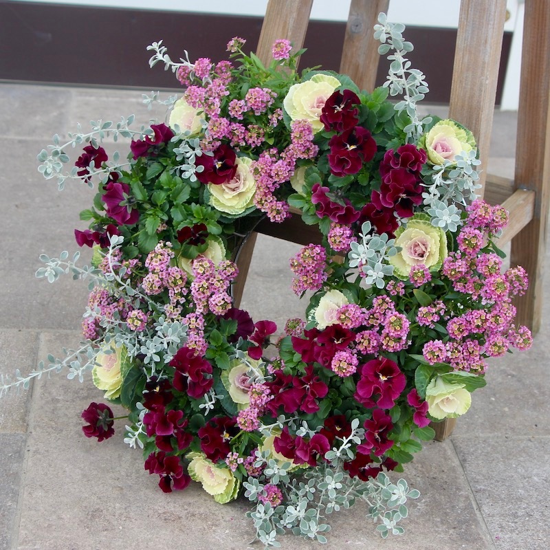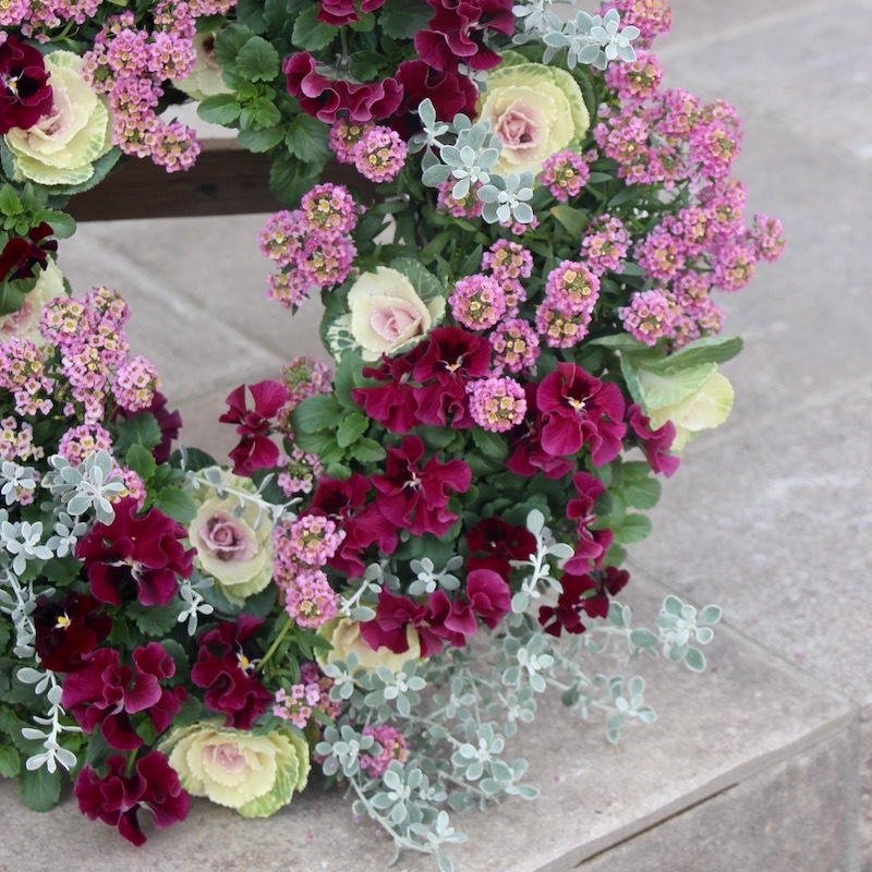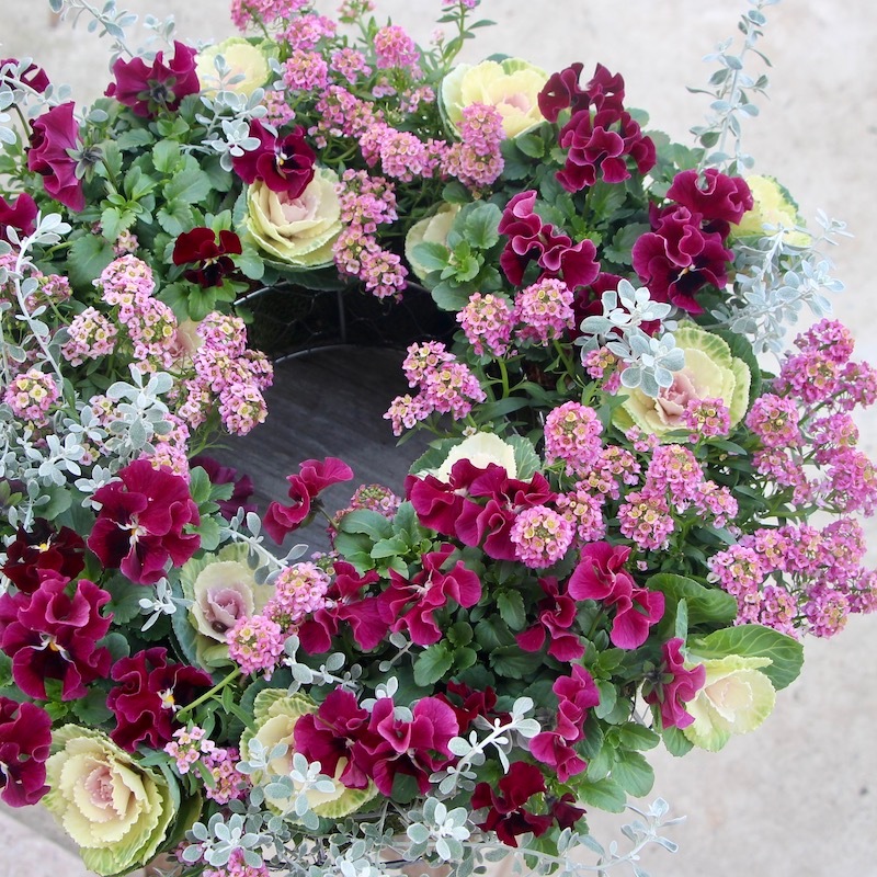 大きいメッシュワイヤーバスケットに寒さに強い花やリーフを惜しみもなく(笑)ぎゅっと植え込んで華やかなリースに仕立てました♪