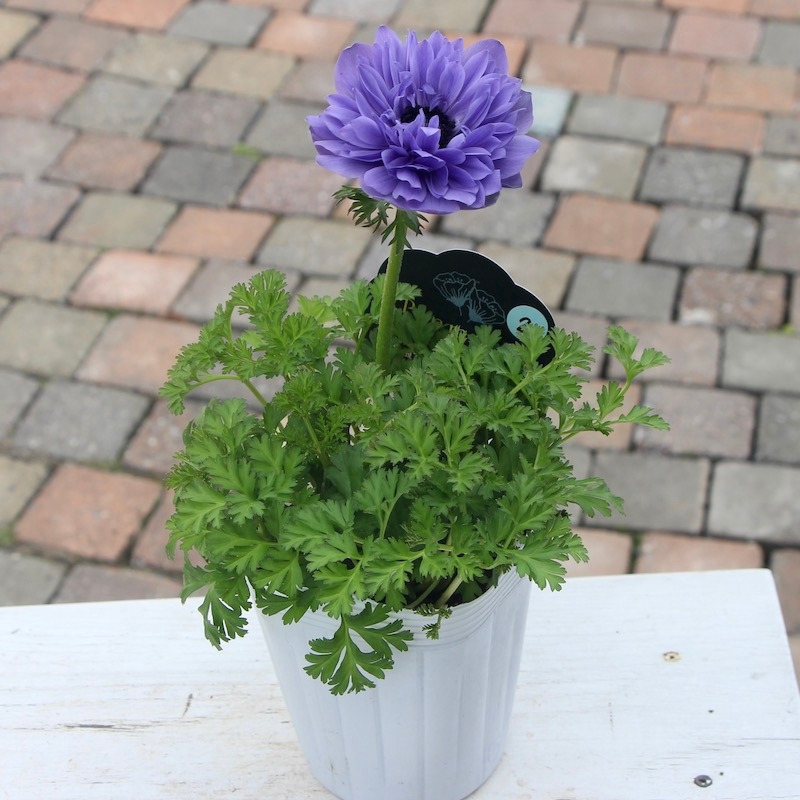 アネモネといえば、まだ寒さの残る春一番に鮮やかな大輪花(花径約5~8cm)を次々と咲かせてくれる秋植え球根ですが、今回ご紹介するのは、画像のような開花もしくは蕾付きラベル苗です。
