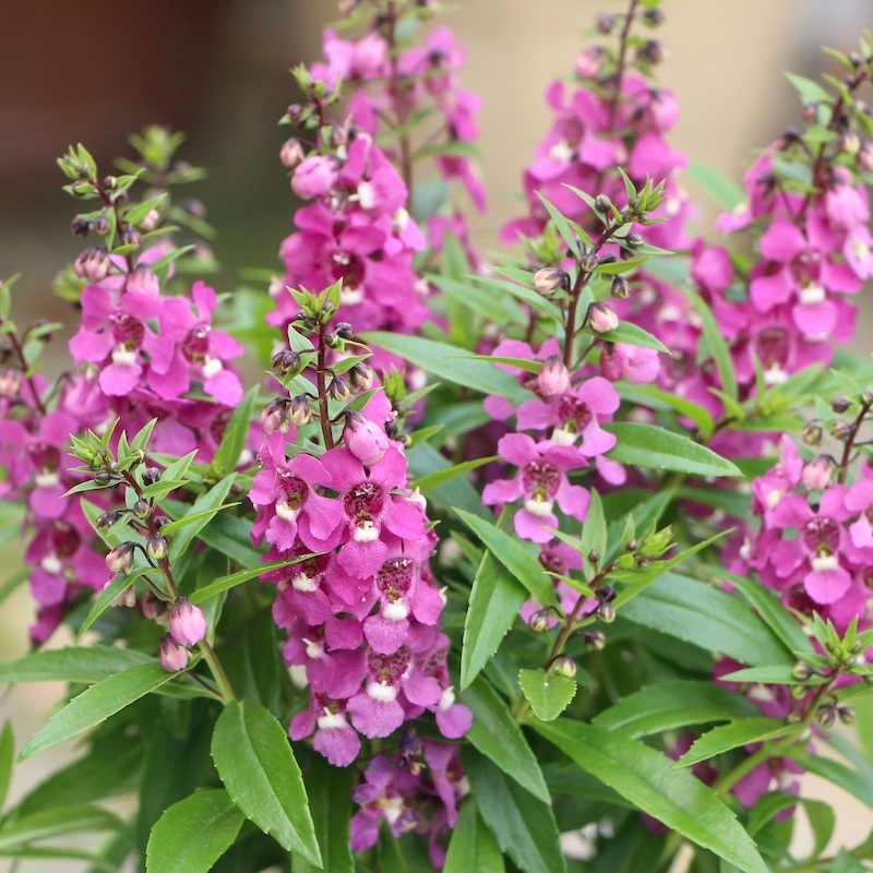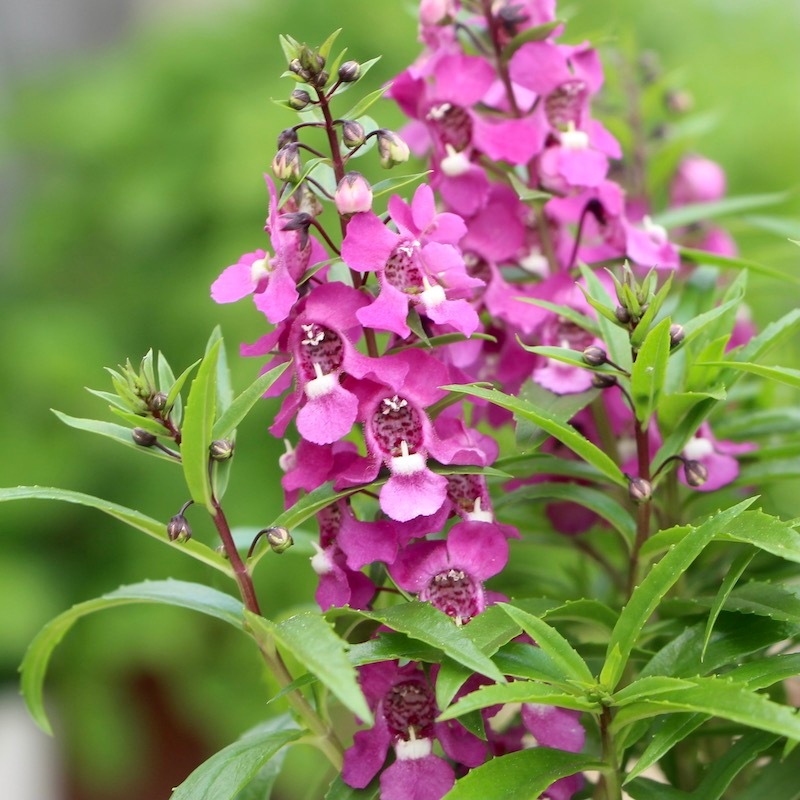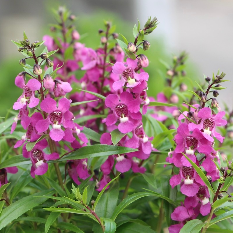 それに、この株なら花が途切れそうにありません。 そして、この株なら小枝が折れても平気。(笑) 梱包中に手が当たって小枝が折れ、樹形が不細工になってしばらく販売できなくなる。。。(-_-;) ということもなさそう~。もちろん、細心の注意は払うのですが^^; とっても上品で涼しげな花「アンゲロニア」 高温多湿にとっても強く、おすすめの丈夫な花です。 もちろん、春夏だけでなく晩秋まで途切れず長い間咲いてくれます。