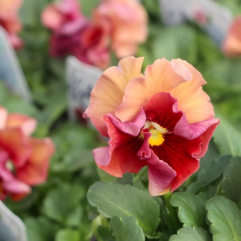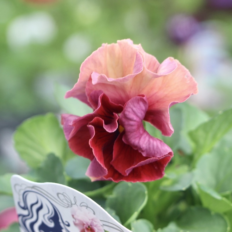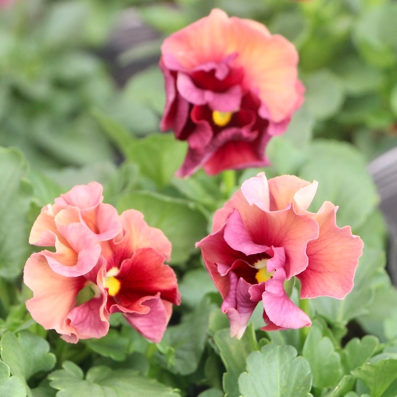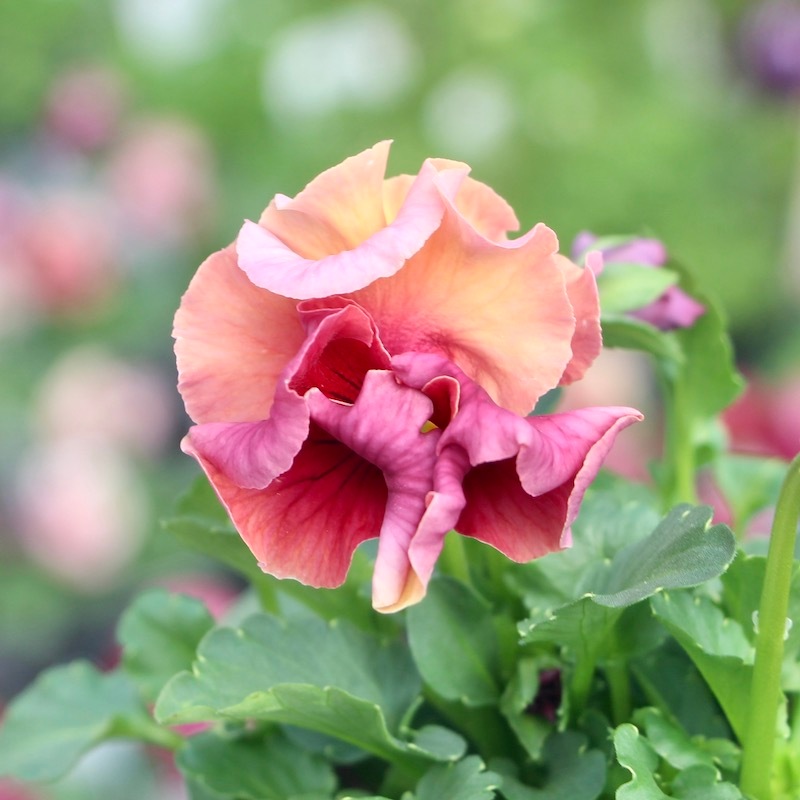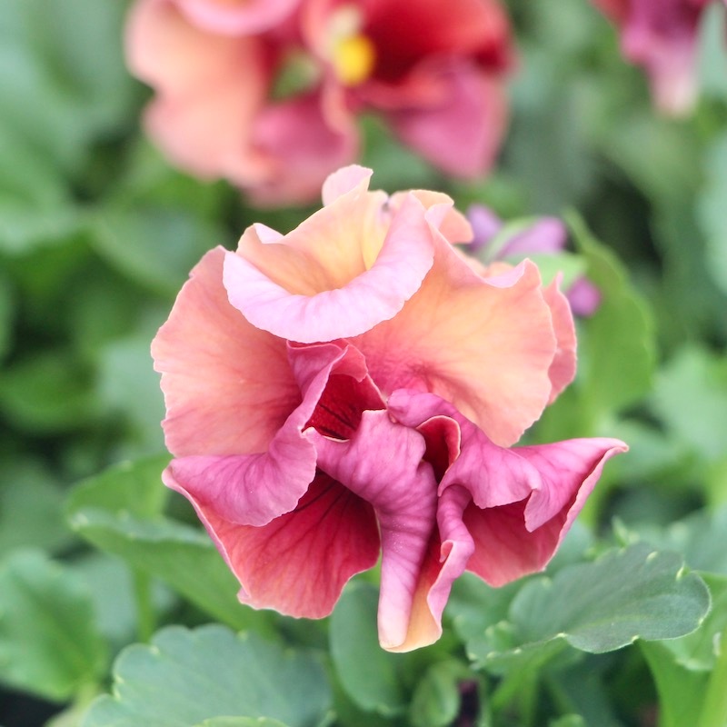 パンジーとしては小さ目ですが、フリル?フリンジがしっかり効いているので、花径の割に存在感があります。 花は小さ目ですが、フリルと複雑に混ざった色合いがゴージャスで、とっても華やかです♪