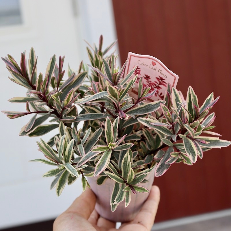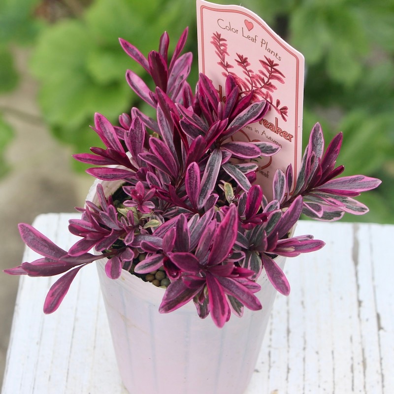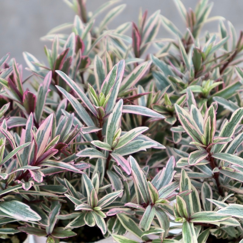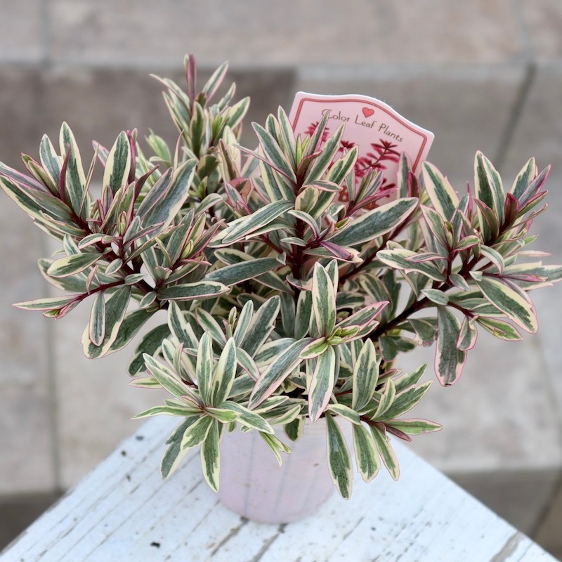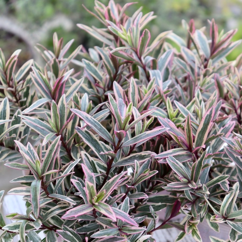 よく分枝したボリュームのある美しい樹形に、夏季は涼し気な斑入り葉、冬季は紅葉したピンクの葉がとっても可愛いカラーリーフ♪