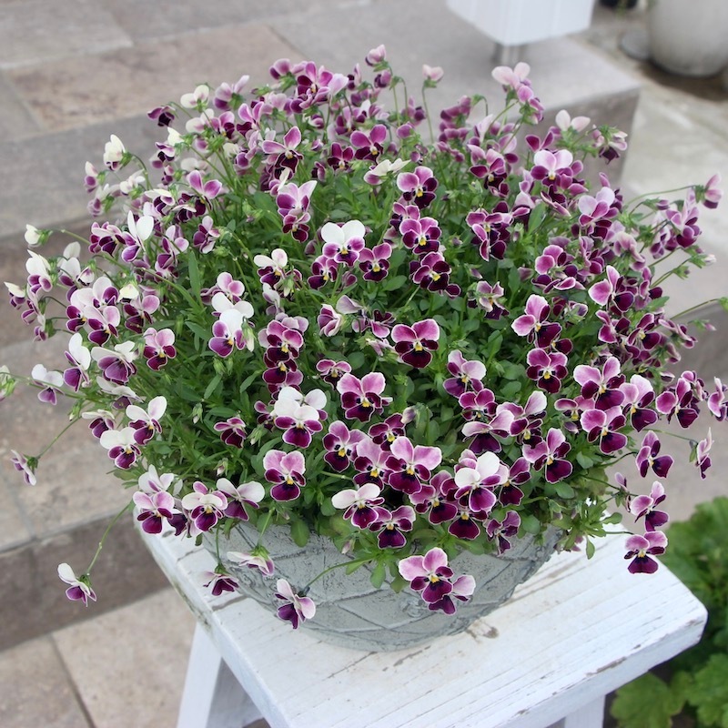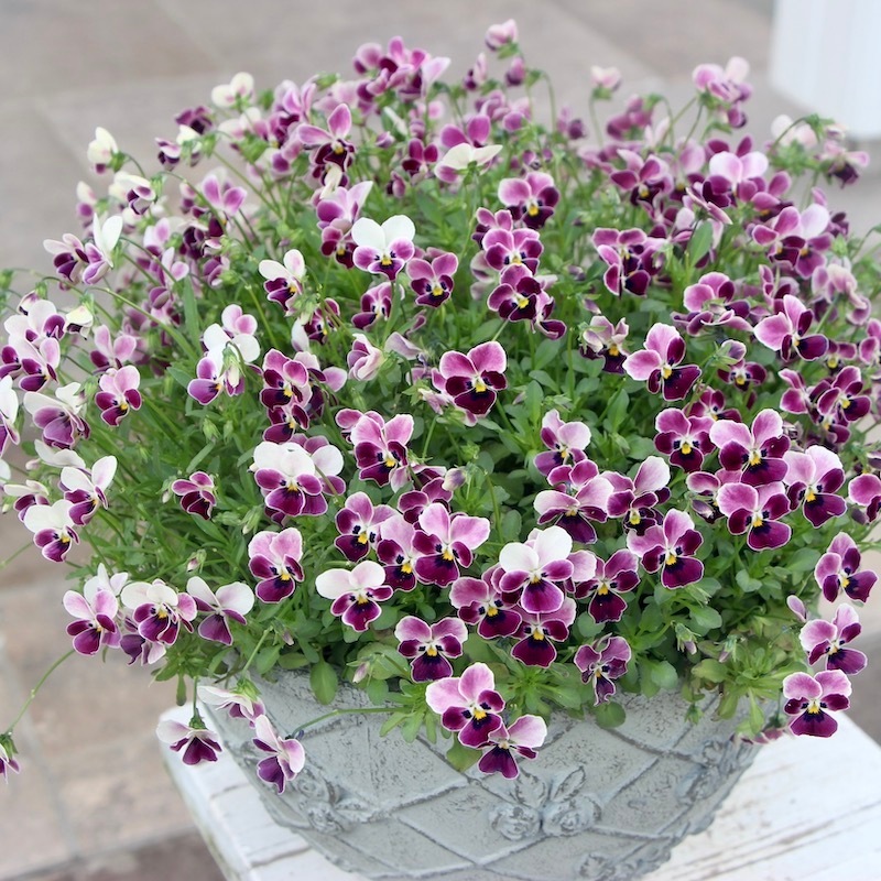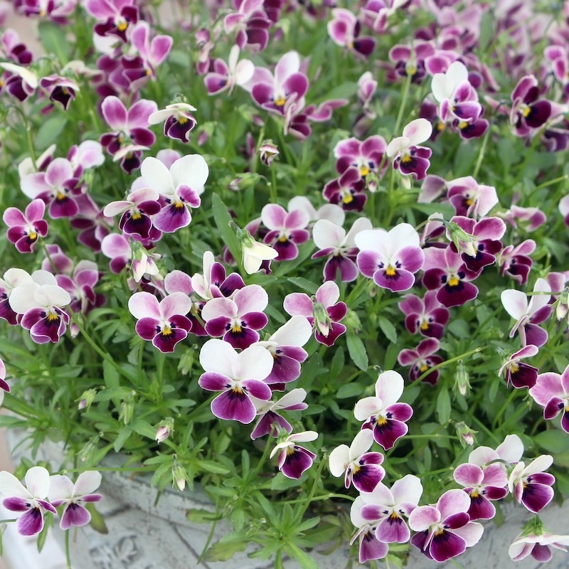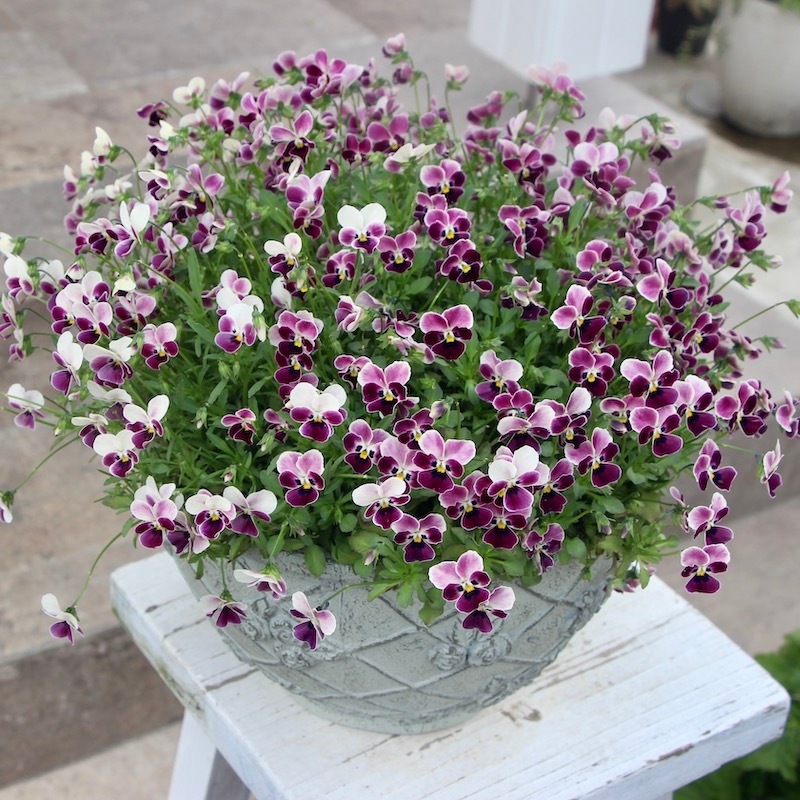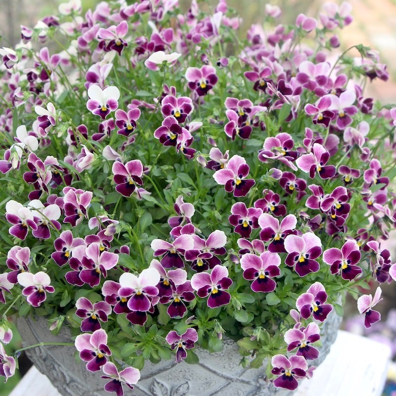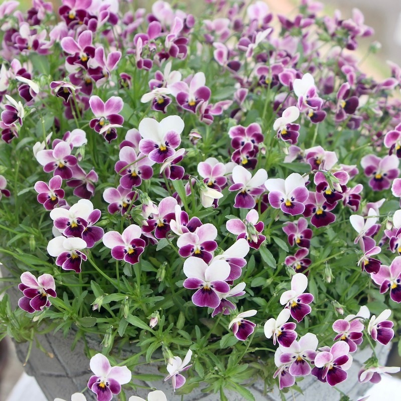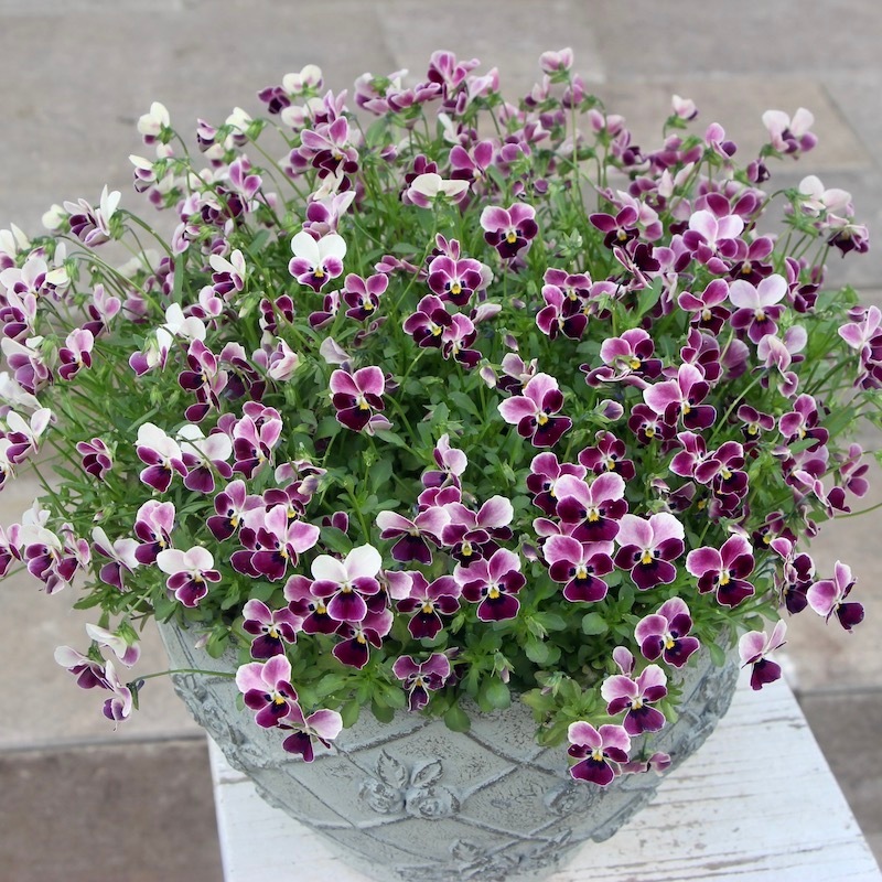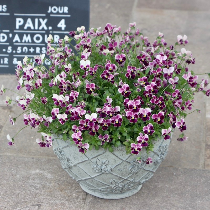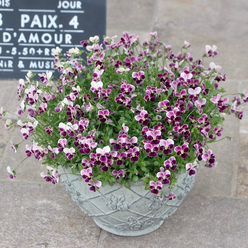 苗で販売できなかったこのあずきのようなビオラの色とこの鉢の色、相性も良くて思わず見本鉢におろしました。なので、まだ新品ピカピカです~