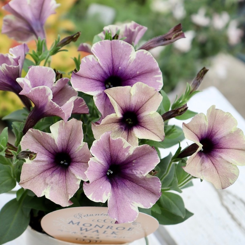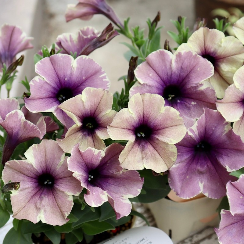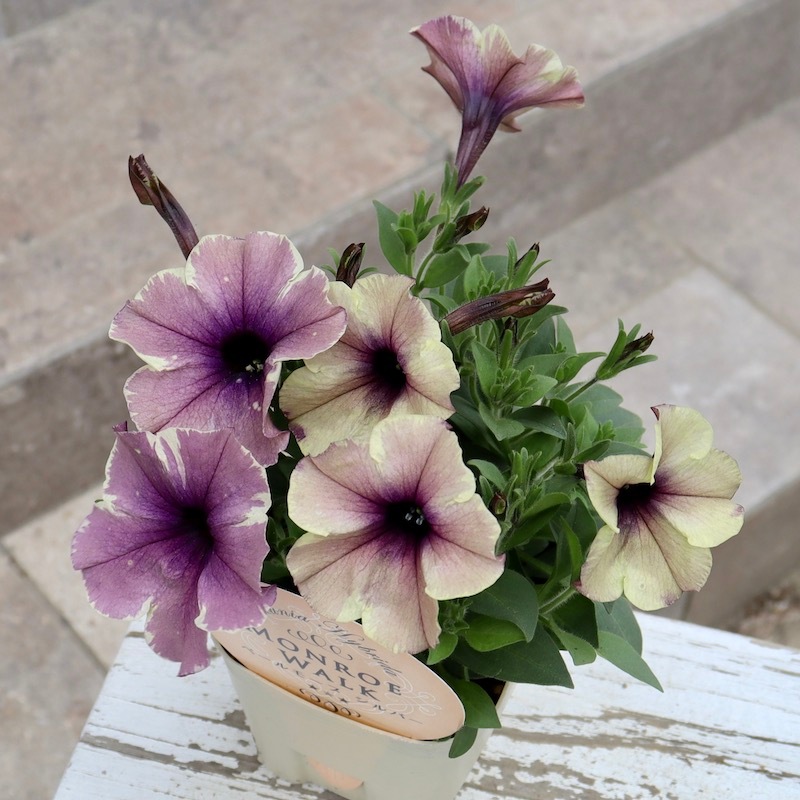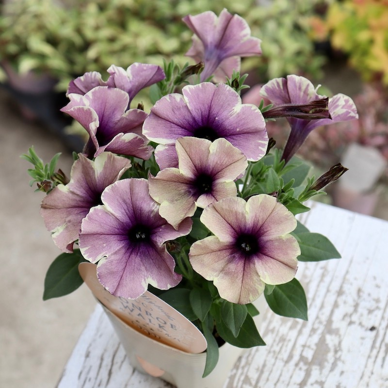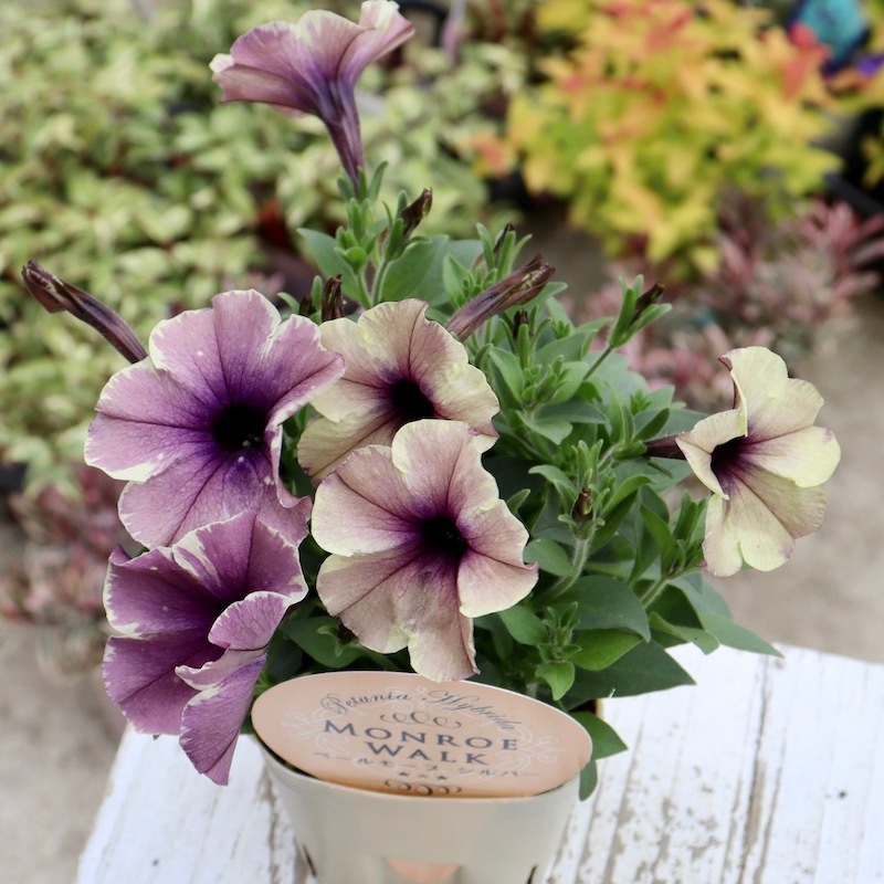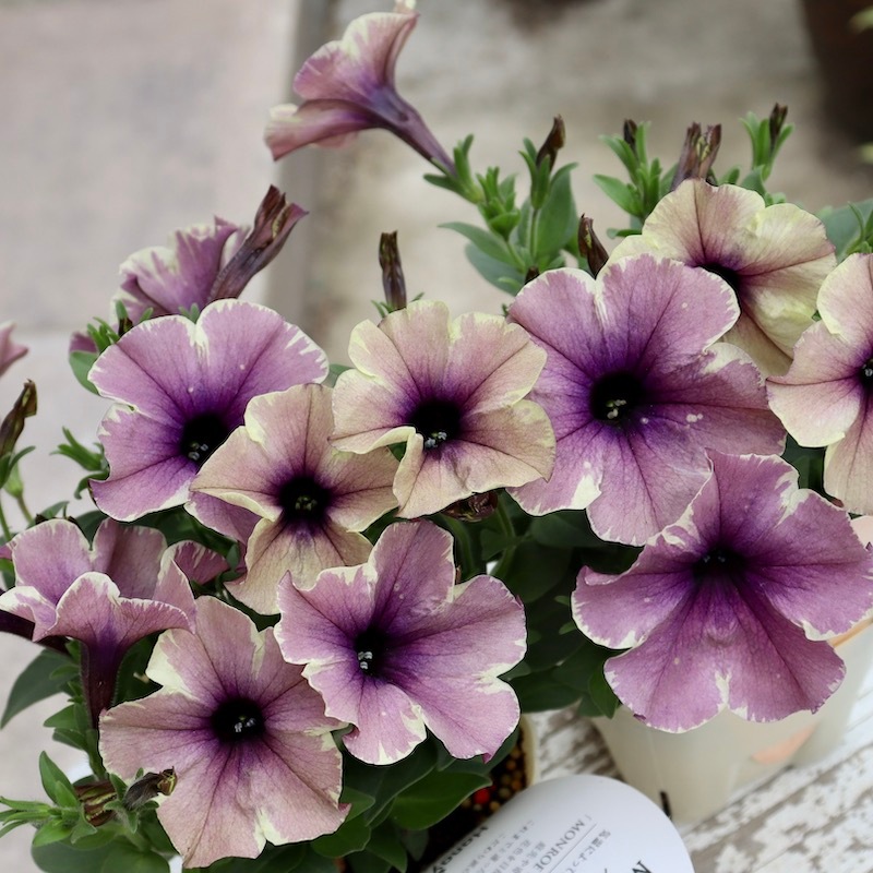 花芳さんのペチュニアは一重も渋すぎず、甘すぎずの花色が揃っていますよ。 こちらはモンローウォークシリーズ。 淡い色の花は大好きですが、そればかりだとボケてしまう事がありますよね~ また、アンティークな花色も素敵だけど。。。暗すぎるって事もありますよね~