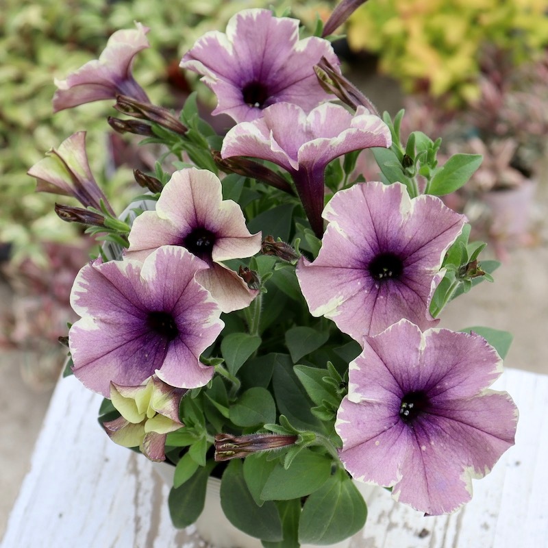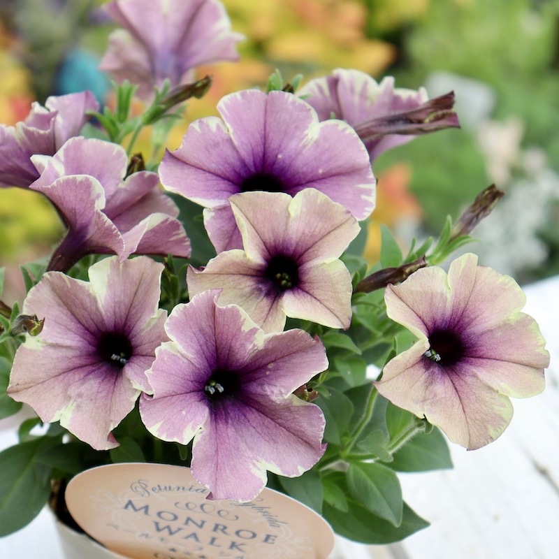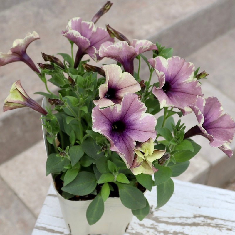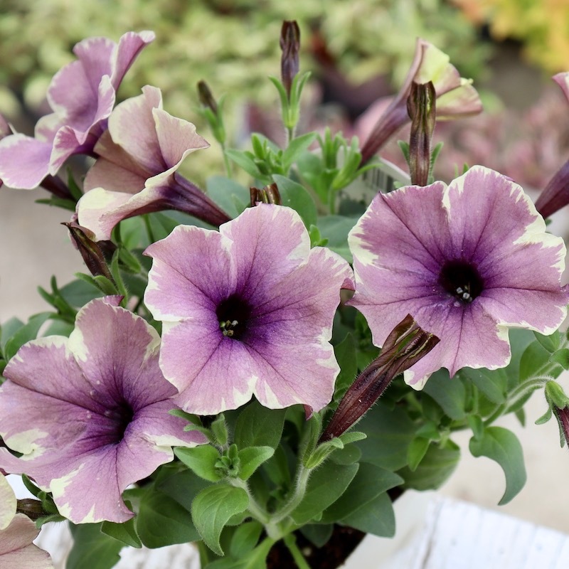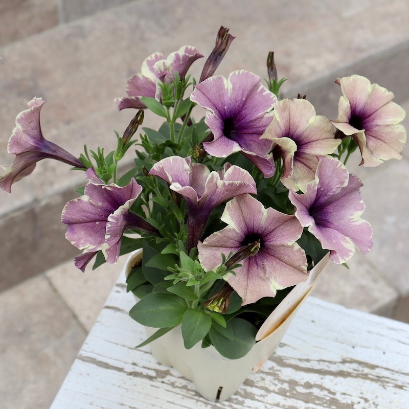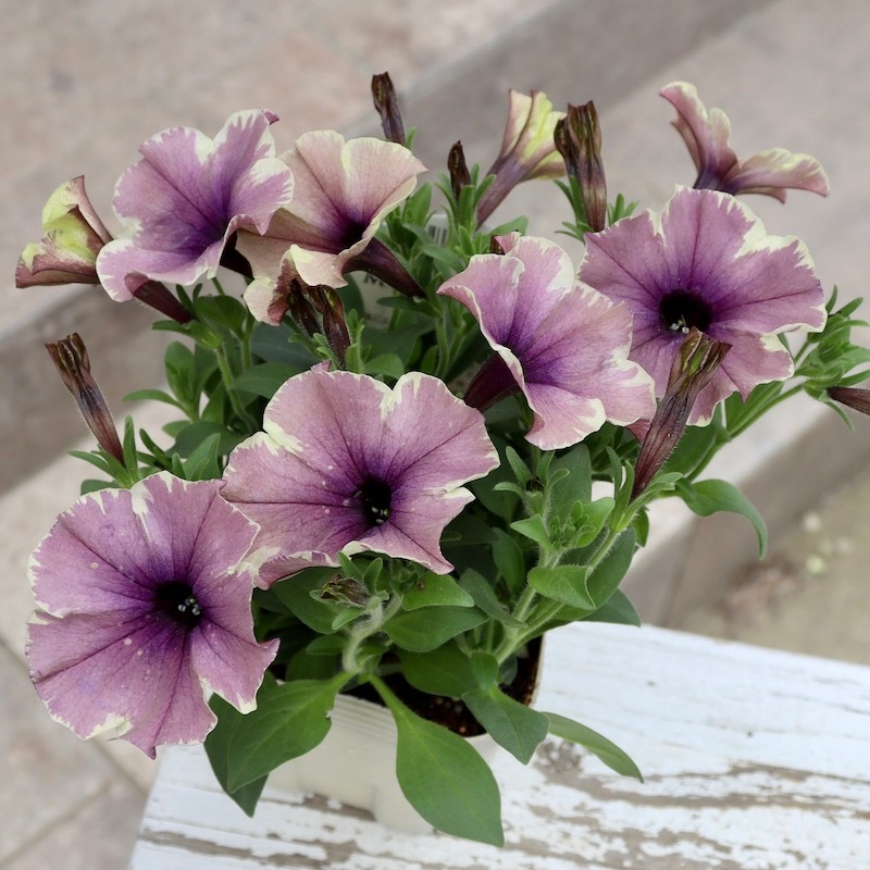 花芳さんのペチュニアは一重も渋すぎず、甘すぎずの花色が揃っていますよ。 こちらはモンローウォークシリーズ。 淡い色の花は大好きですが、そればかりだとボケてしまう事がありますよね~ また、アンティークな花色も素敵だけど。。。暗すぎるって事もありますよね~