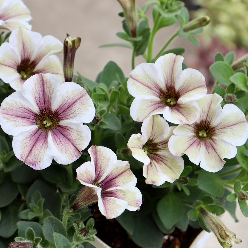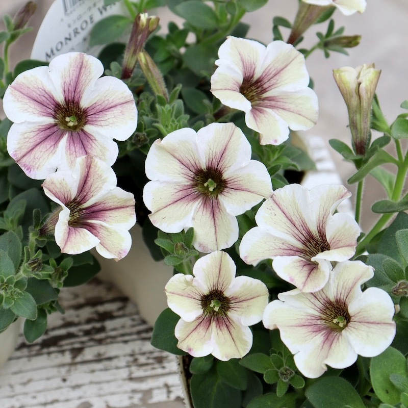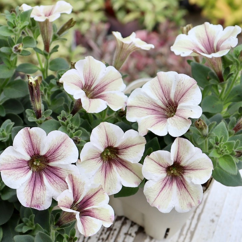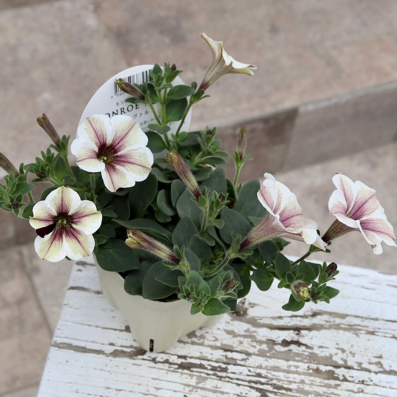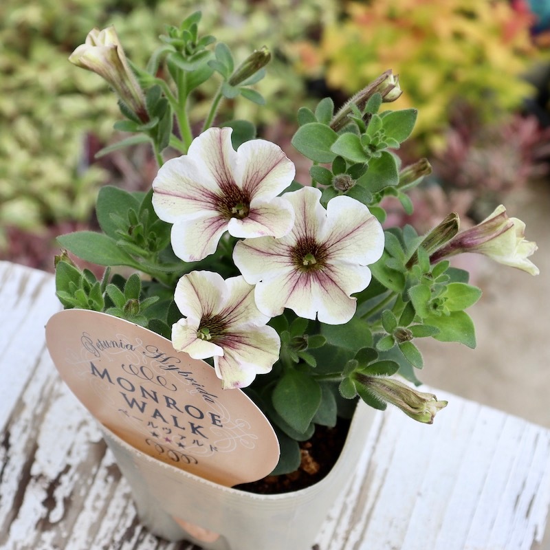 花芳さんのペチュニアは一重も渋すぎず、甘すぎずの花色が揃っていますよ。 こちらはモンローウォークシリーズ。 淡い色の花は大好きですが、そればかりだとボケてしまう事がありますよね~ また、アンティークな花色も素敵だけど。。。暗すぎるって事もありますよね~