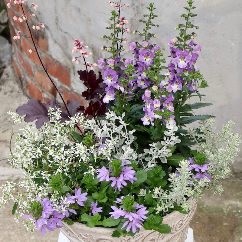 最後の1枚(寄せ植え画像)のみ、今回入荷した苗で植え込んだ寄せ植えで、2025年5月28日に撮影したものです。 ちょっぴり高さのある植物も必要ですよね。