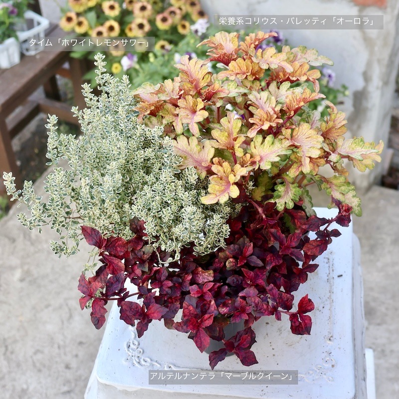 コリウスだけでお庭の主役にもなれます。 もちろん、寄せ植えではお花を引き立てる脇役にもなれますよ。