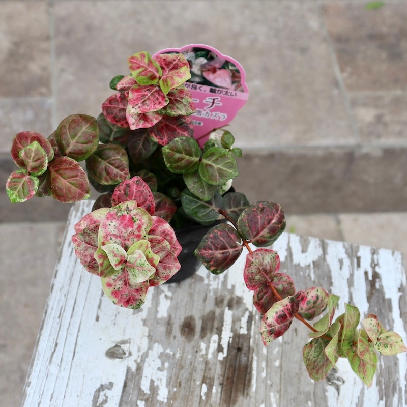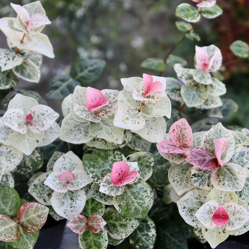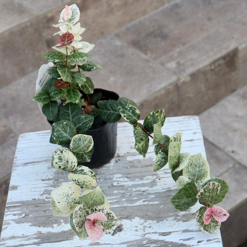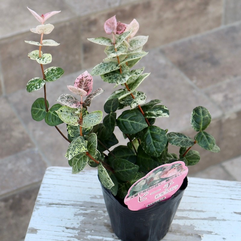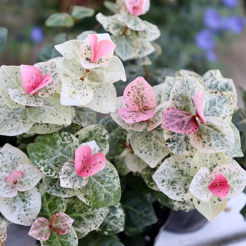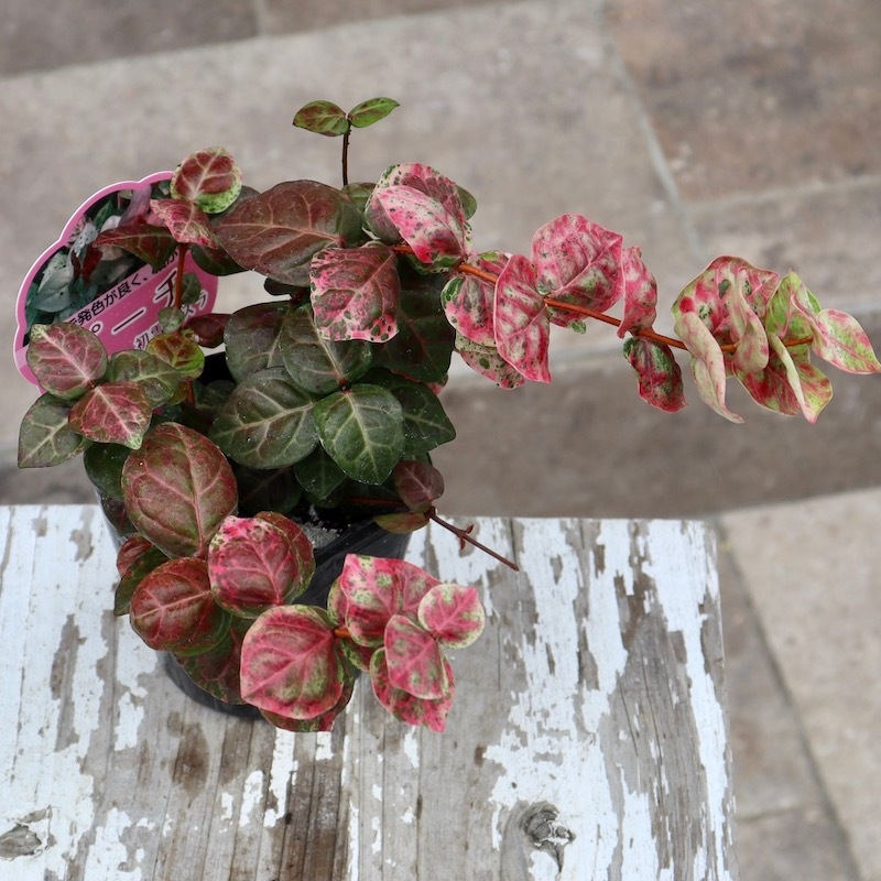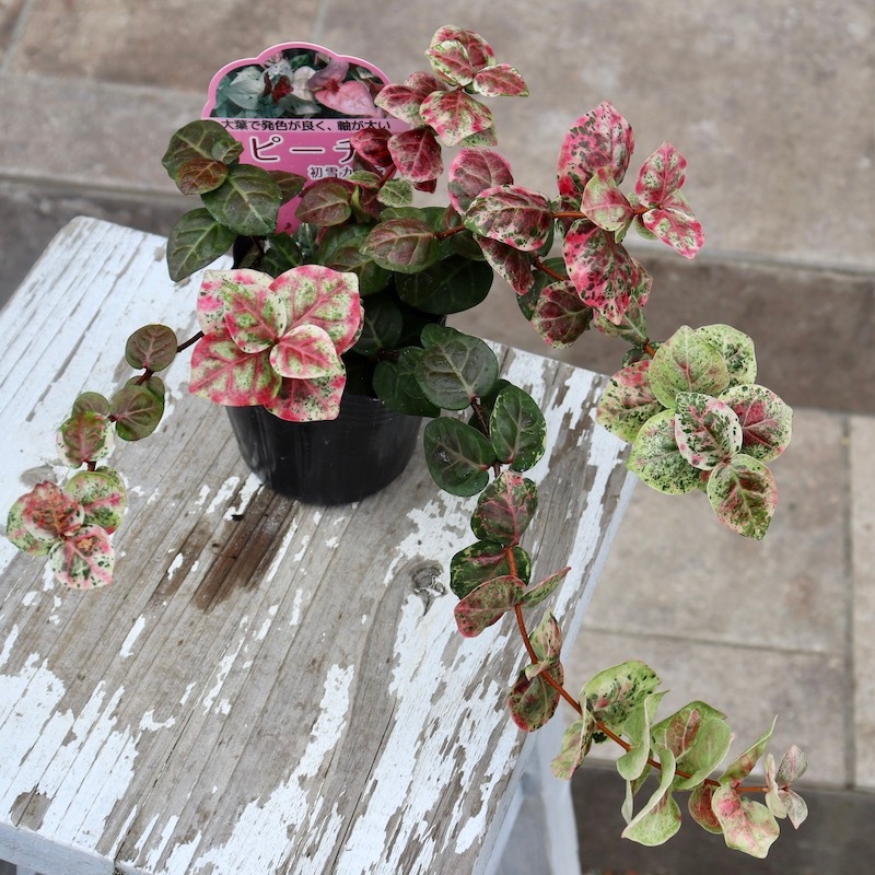 横に這うように広がります。 ただ、生育スピードはゆっくりめ。暴れて困ることもなく、お手入れも楽ちんですね。 カラーリーフとして寄せ植えに入れたり、グランドカバーに植え込むのもオススメです。 植えっぱなしでゆっくり育てるイメージです。 ツルを絡ませて高く這わせると、それもまた目を引いて素敵です。 春~秋には、濃いピンクの新芽がとっても可愛いんです。 そのピンク色が次第に淡くなり、次第に緑の葉に白い斑入りが綺麗な葉に変わります。 そして、その後はもっともっと濃い緑色に変わっていくんですが、それらのすべての色の変化を1つの株で楽しめる!それがハツユキカズラの魅力なんですよね。