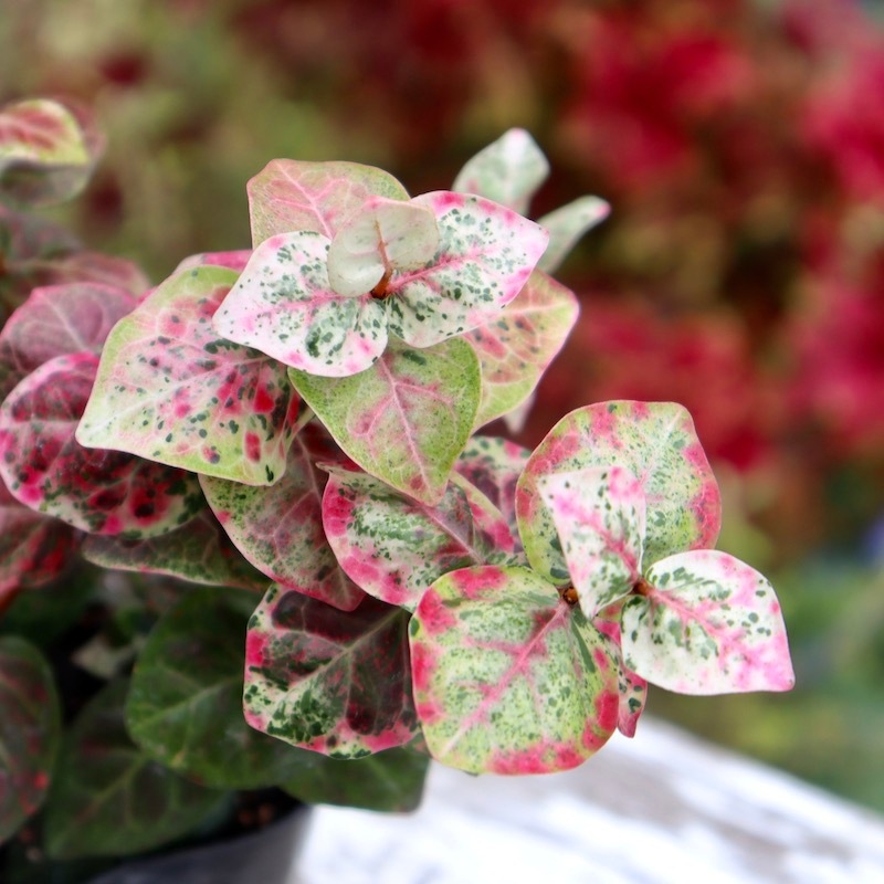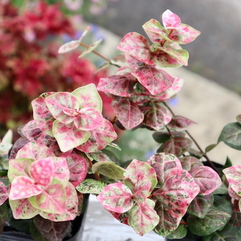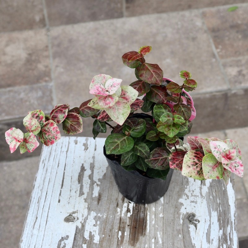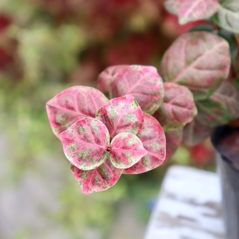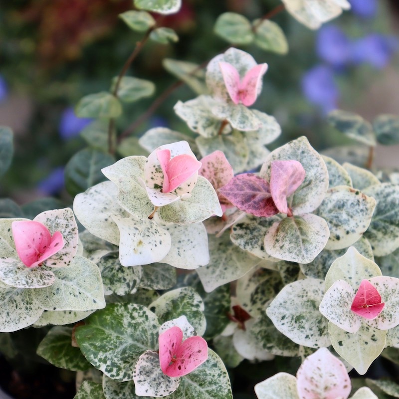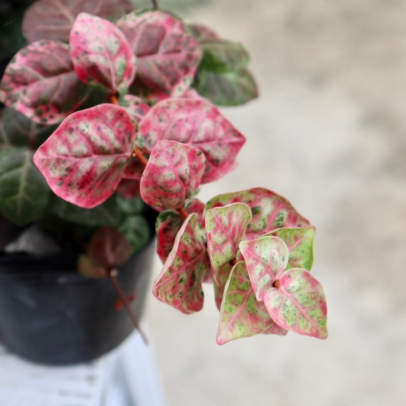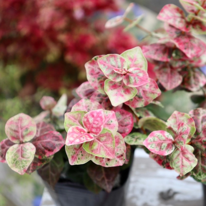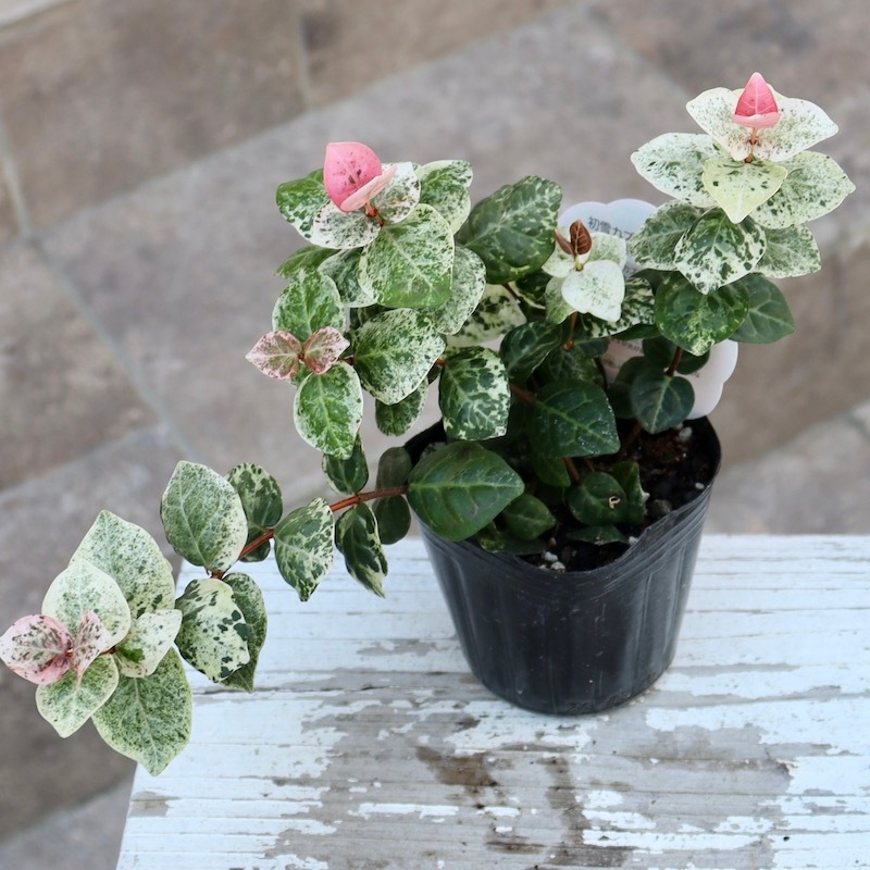 横に這うように広がります。 ただ、生育スピードはゆっくりめ。暴れて困ることもなく、お手入れも楽ちんですね。 カラーリーフとして寄せ植えに入れたり、グランドカバーに植え込むのもオススメです。 植えっぱなしでゆっくり育てるイメージです。 ツルを絡ませて高く這わせると、それもまた目を引いて素敵です。 春~秋には、濃いピンクの新芽がとっても可愛いんです。 そのピンク色が次第に淡くなり、次第に緑の葉に白い斑入りが綺麗な葉に変わります。 そして、その後はもっともっと濃い緑色に変わっていくんですが、それらのすべての色の変化を1つの株で楽しめる!それがハツユキカズラの魅力なんですよね。