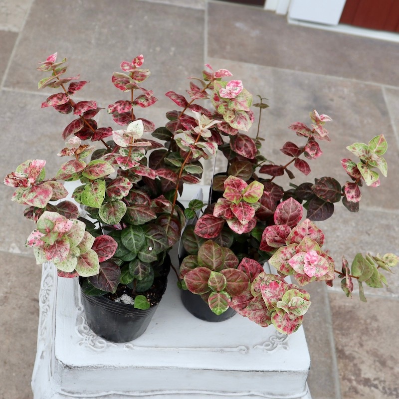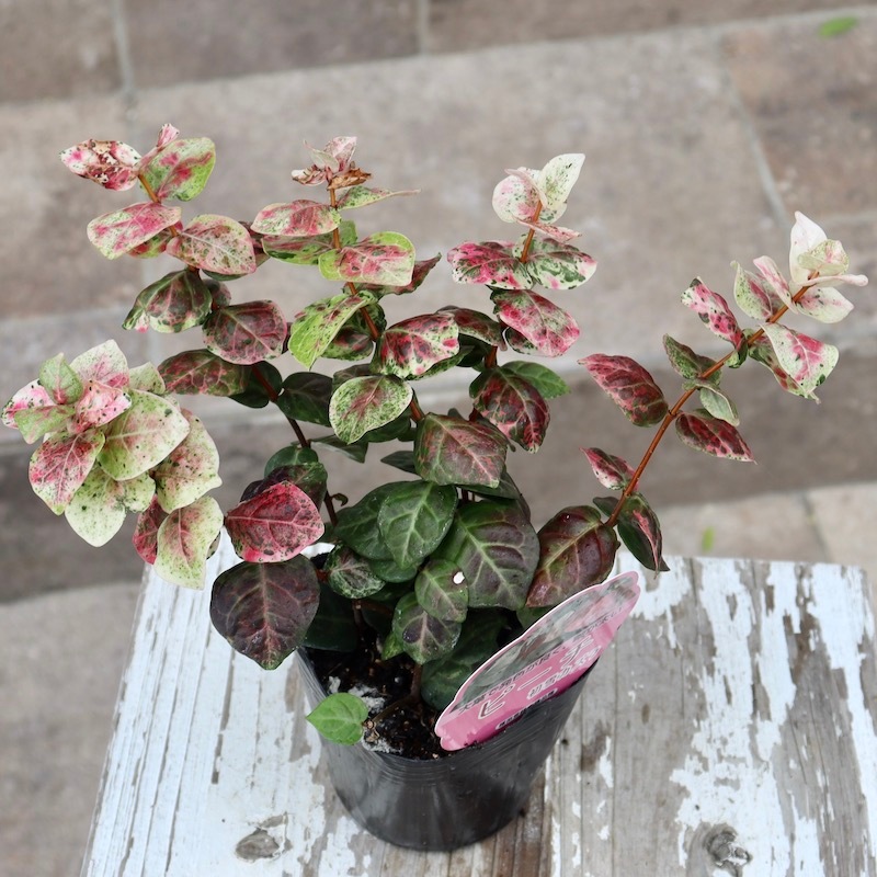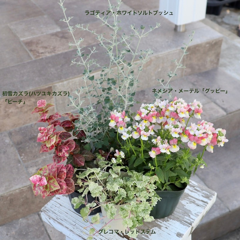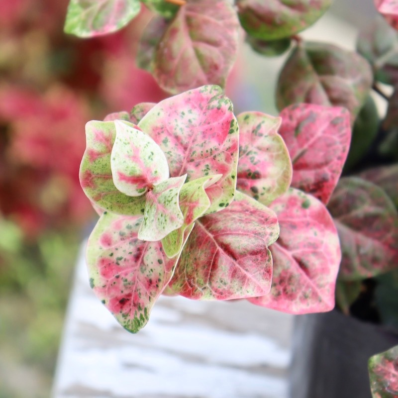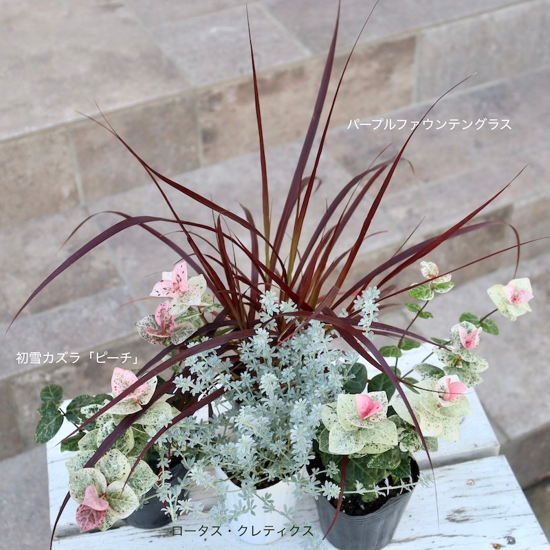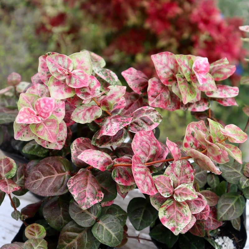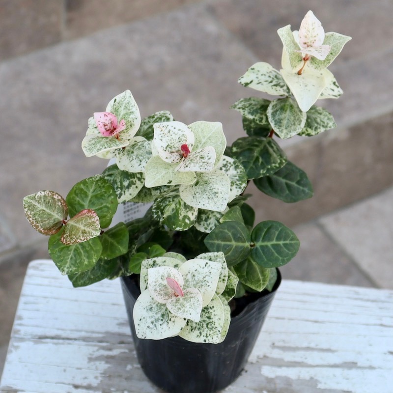 横に這うように広がります。 ただ、生育スピードはゆっくりめ。暴れて困ることもなく、お手入れも楽ちんですね。 カラーリーフとして寄せ植えに入れたり、グランドカバーに植え込むのもオススメです。 植えっぱなしでゆっくり育てるイメージです。 ツルを絡ませて高く這わせると、それもまた目を引いて素敵です。 春~秋には、濃いピンクの新芽がとっても可愛いんです。 そのピンク色が次第に淡くなり、次第に緑の葉に白い斑入りが綺麗な葉に変わります。 そして、その後はもっともっと濃い緑色に変わっていくんですが、それらのすべての色の変化を1つの株で楽しめる!それがハツユキカズラの魅力なんですよね。