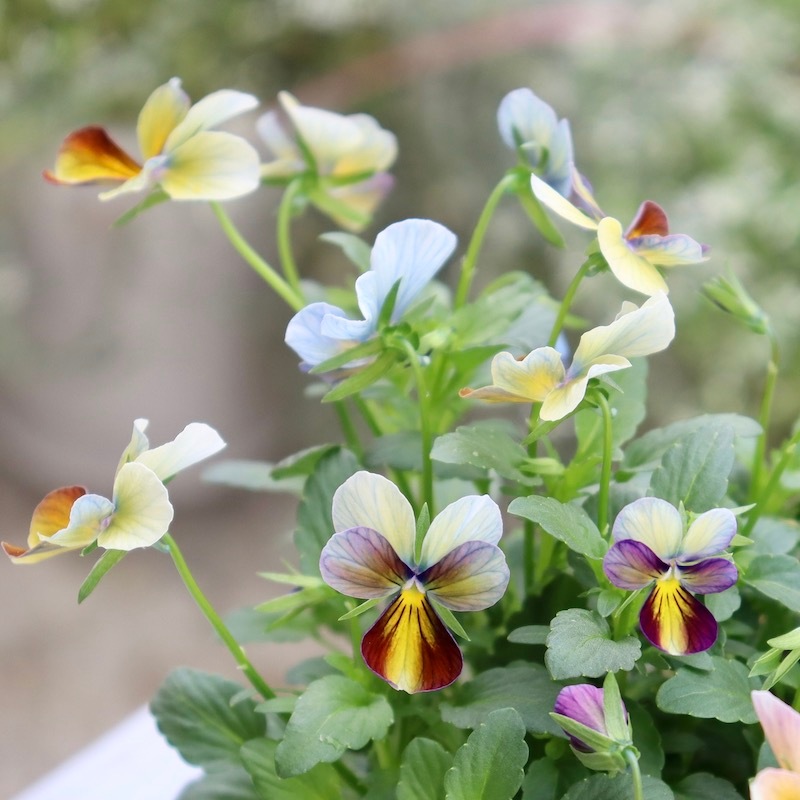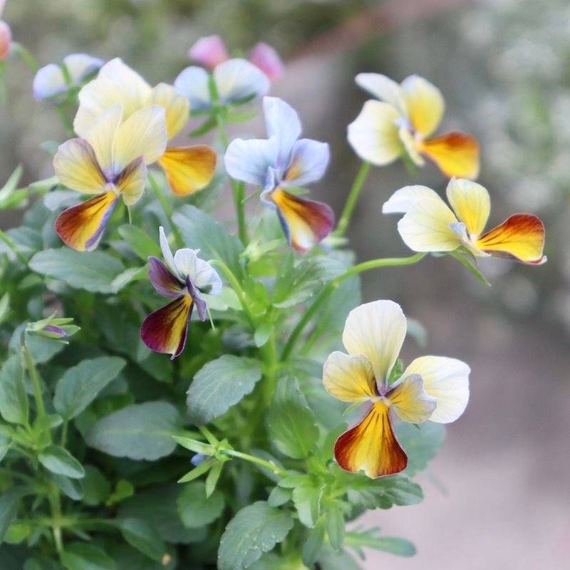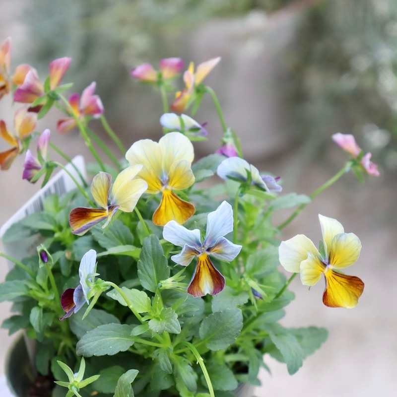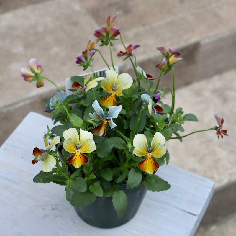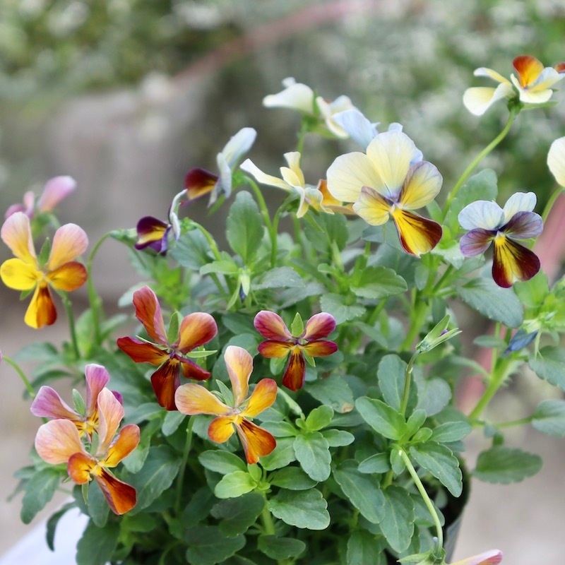 ちょっと渋いブラウン系の花かと思っていたのに、届いたら個性派ミックスビオラでした。笑