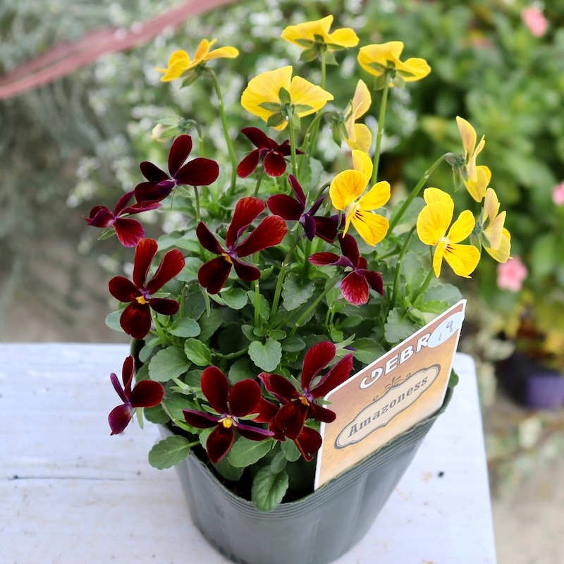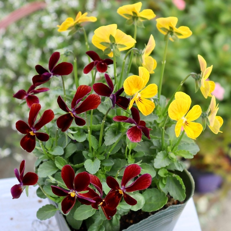 ちょっと渋いブラウン系の花かと思っていたのに、届いたら個性派ミックスビオラでした。笑