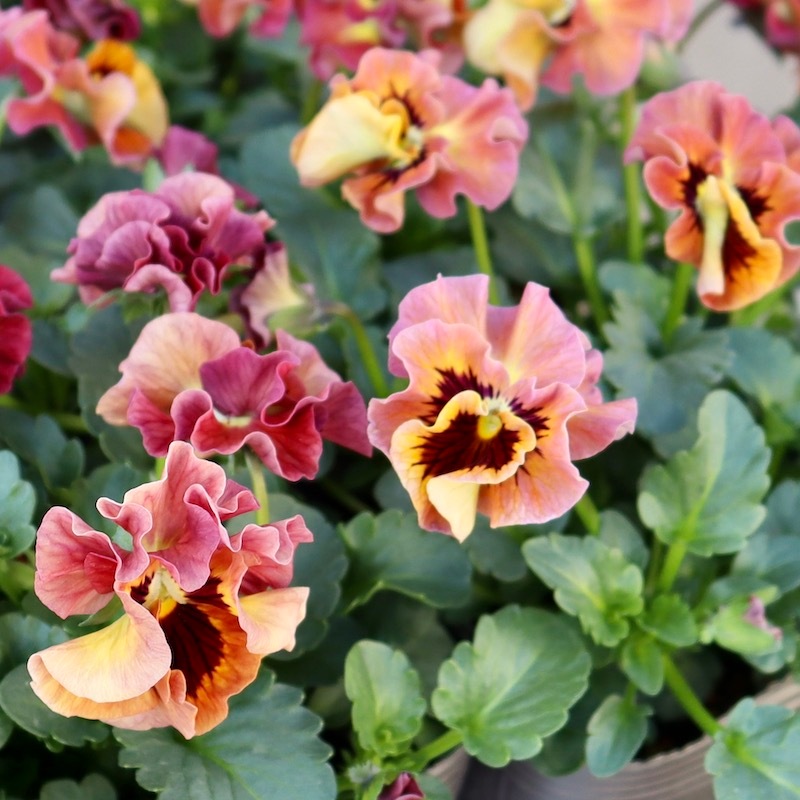 高知の植田さんの長年大人気のフリル咲きミニパンジー「天の羽衣」 (例年通り、細かすぎる色分けをしていますので、今後開花が進むと花色が変わってくるものもあります。現在の花色での色分けです。あらかじめご了承ください。)