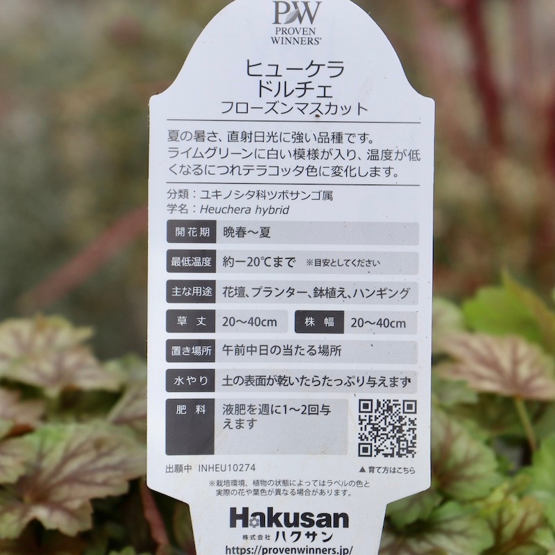| 3/15 僅かですが、在庫を追加!! これで最後です。もう予備在庫はありません^^; お待たせしましたm(_ _)m 超良株販売スタート!! 掲載画像はすべて2024年1月8日に撮影したものです。 画像の現品もしくは同等品をお届けします。 最新の入荷株の状態は Instagramの動画でご覧頂けます♪ ************************* 定評のあるPW! 美しい発色のドルチェシリーズ 生産者はいつもピカイチの超良株ばかり出荷して下さる信頼の高い神花園さんの生産苗なので安心です。(神花園さんのヒューケラは残念ながら今回でおしまいになりそうですが^^;) 他の生産者さんの苗は早くから沢山出回っていますが、神花園さんの株が秋に出来上がるのをひたすら待っていました!! しっかり手間暇をかけて作り込まれた株は全然違うのです。 他の方より出荷可能になるタイミングが遅いのですが、いくら市場でたくさん出回っていても「待つ」気にさせてくれる苗。 植物って一番に出荷された先取りがお得ではないんですよね。 でもねー待って待って待ちわびて入荷したのは11月に入ってから。 当店はすでにパンジービオラの超繁忙期に突入しており、どうにもならず^^; しかも、撮影なしで販売可能な品種が入っていない^^; 手もかからず、慌てなくても販売できる丈夫な多年草苗はまたまた後回しにされてしまいました。 ということで、11月に入荷できたというのに、販売は1月からになりました。 お待たせしましたm(_ _)m でも、当店はしっかり管理もしているので、とっても綺麗です(^_-)-☆ ヒューケラはちょっと高値の苗ですが、これだけ綺麗で年中楽しめるのだから納得ですよね〜。 「ヒューケラ」は、耐寒性のある多年草(宿根草)で、カラーリーフとして人気の植物。 その中でも発色の美しいドルチェシリーズです。美味しそうな名前も楽しいですね。 和洋どちらのガーデンにも似合う魅力的な植物です。 お花の近くに飾って置くだけで花もランクアップして見えるから不思議ですね~。 寄せ植えにしてもとっても素敵♪ もちろん、カラーリーフとしても年中楽しんでいただけます。 花壇や単品植えもおすすめ。 日陰でも大丈夫なので、木の下などにもどうぞ。 なお、気温によって葉色が変化します。 そのため、お届け時に画像通りの葉色でない時もあります。 (出来るだけ色々な葉色で撮影をしていますが、撮影できていないものもあります。ラベルの葉色もご参照下さい。) ‥‥‥‥‥‥‥‥‥‥‥‥‥‥‥ 自信を持っておすすめできる苗のみを豊富に取り揃えております。 ‥‥‥‥‥‥‥‥‥‥‥‥‥‥‥