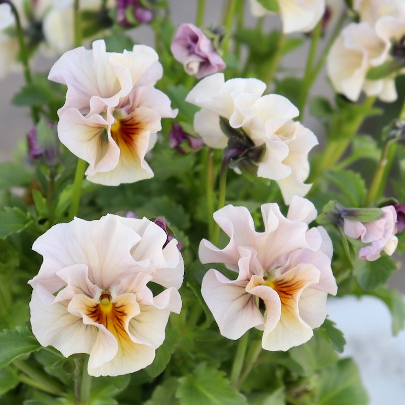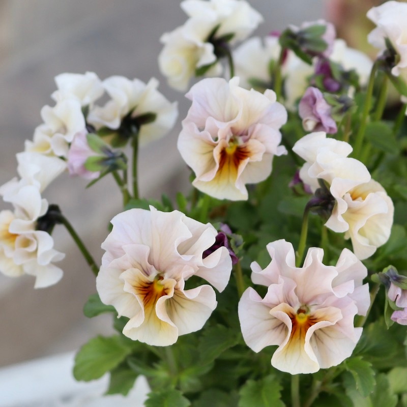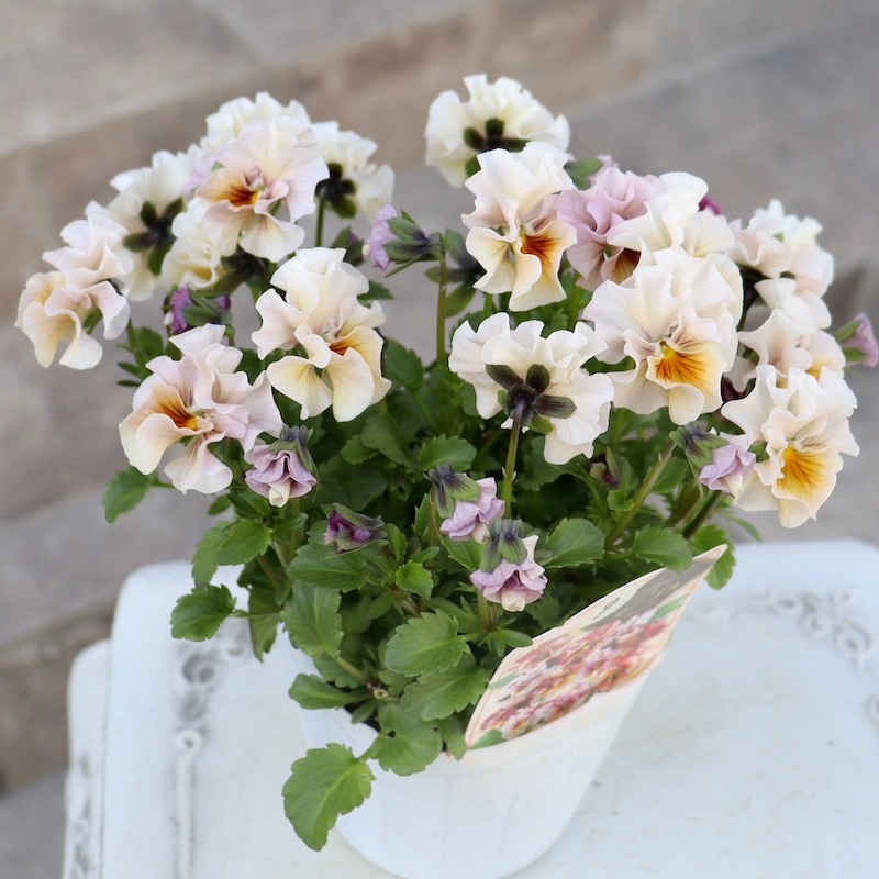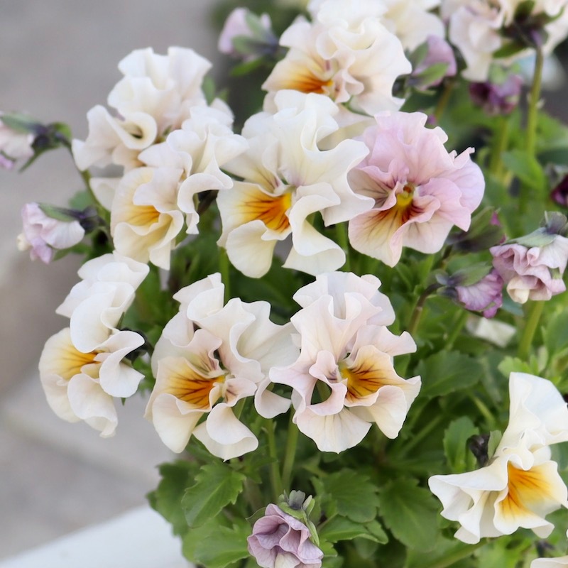 風散歩で扱うビオラの代表選手 「パピヨンワールド」をはじめ、キュートな色、フリフリの数々のパンジービオラを生み出された高知の植田さんのプレミアムな大人気品種です。