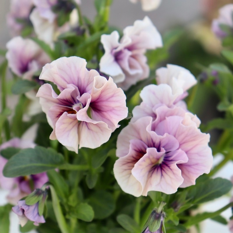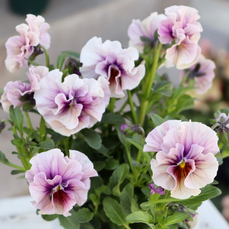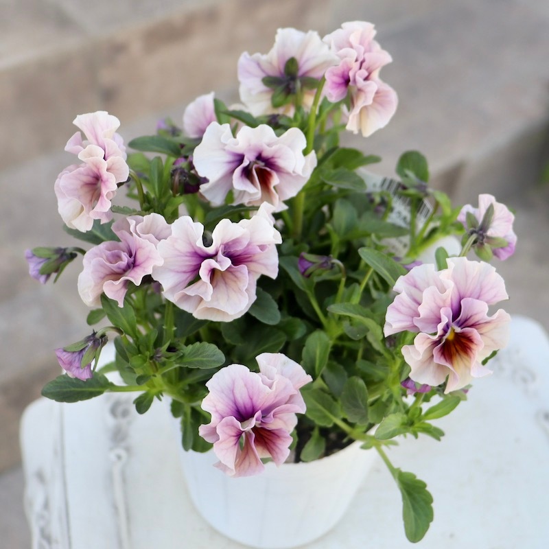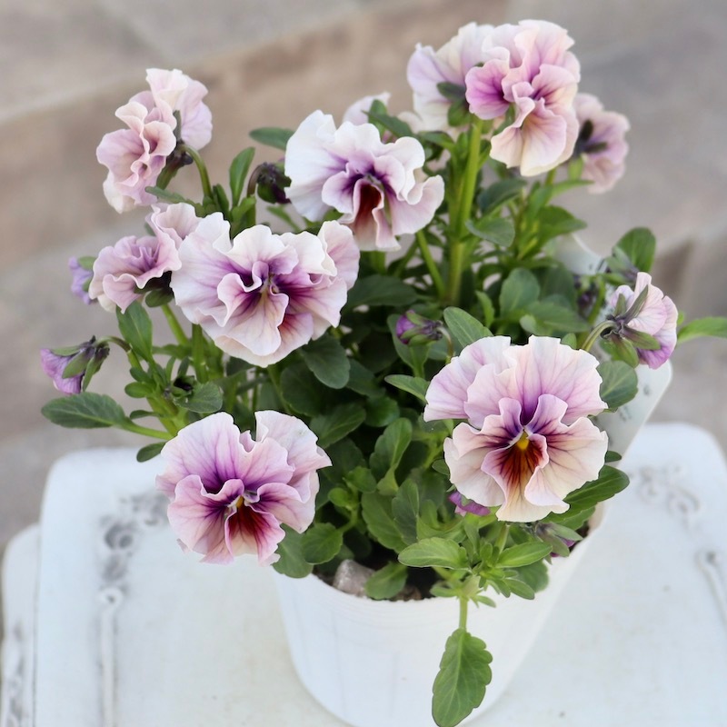 風散歩で扱うビオラの代表選手 「パピヨンワールド」をはじめ、キュートな色、フリフリの数々のパンジービオラを生み出された高知の植田さんのプレミアムな大人気品種です。