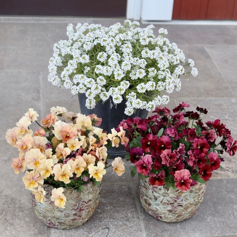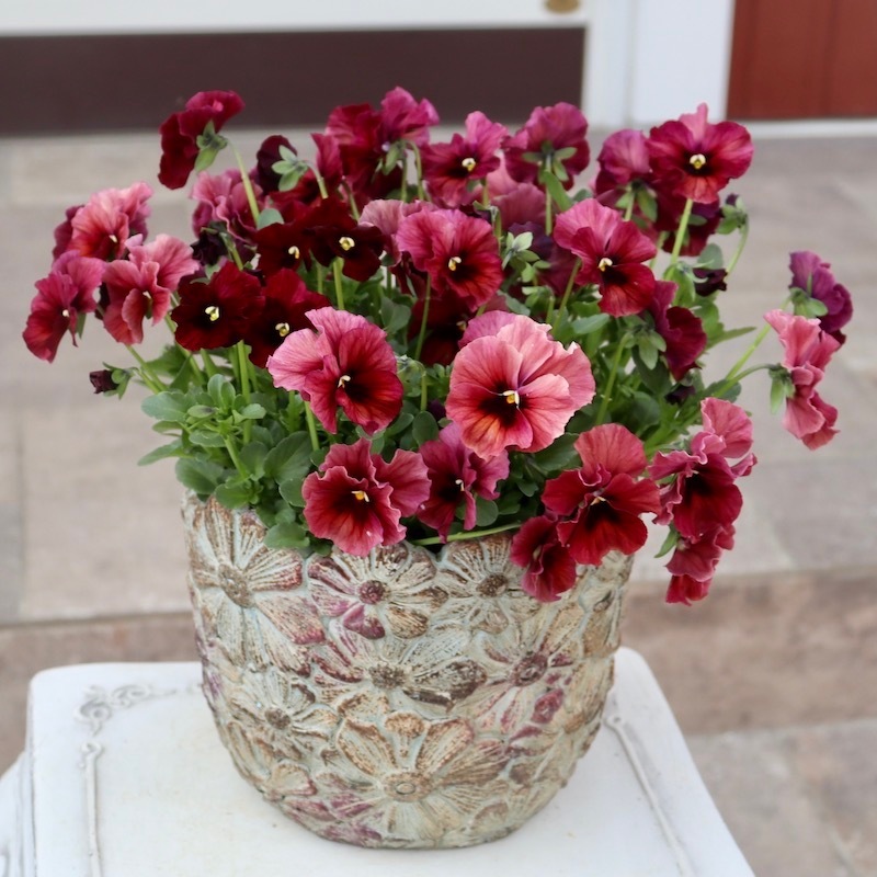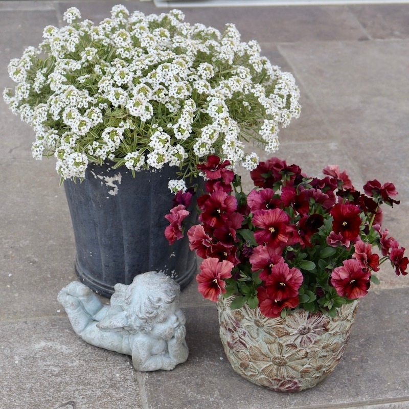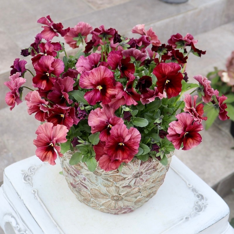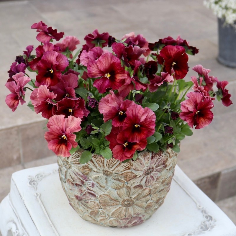 この鉢と相性の良い花で見本鉢を作ろうと苗置き場を見渡すと、即座に花が決まりました!!