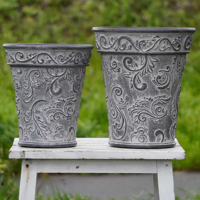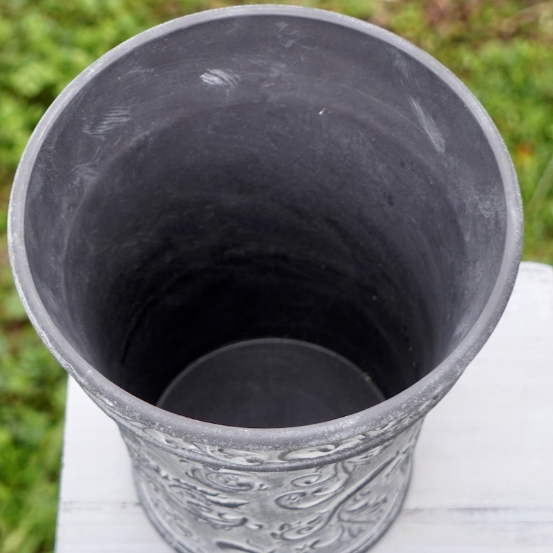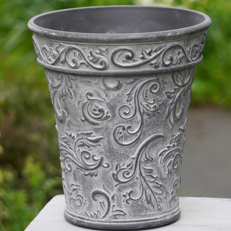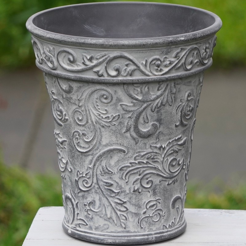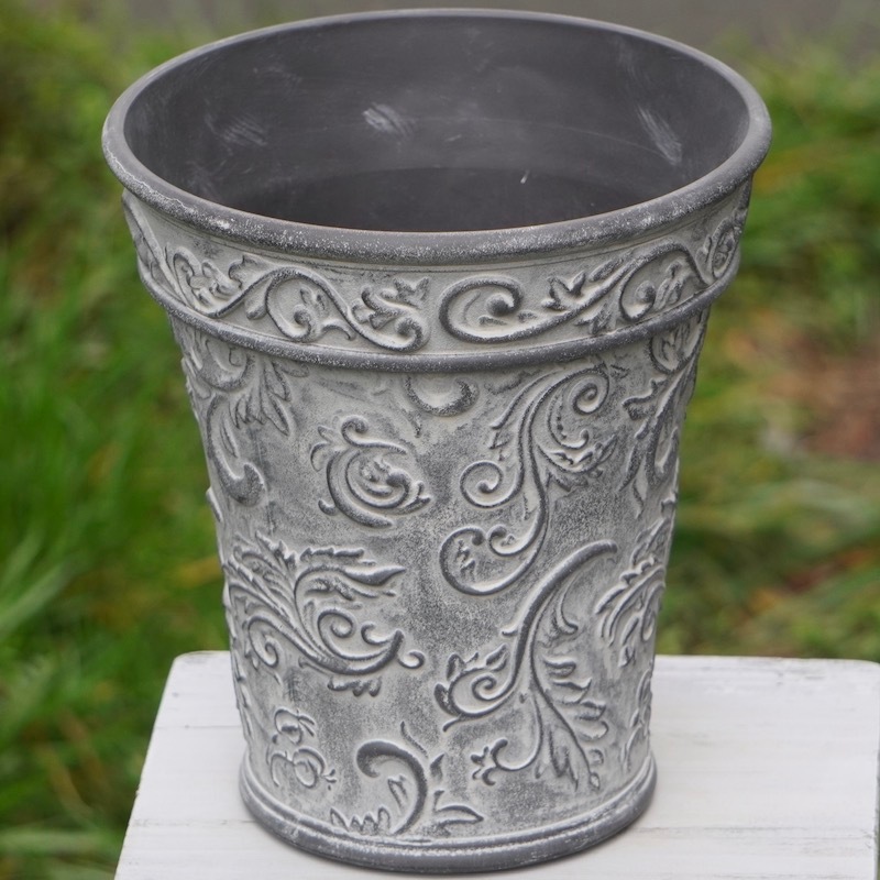 ところが、展示会で見ただけでなく、実際に第一弾で入荷したこの樹脂製品をじっくり見て触ってみて、改めてその素材、品質の虜に。 高級感・立体感のあるクラシックなデザインで品質もバッチリ。 価格も激安ではありませんが、お求めやすい。 普通の安価なプラスティック鉢はホームセンターにたくさん並んでいても、こんな素敵なデザインの良質な樹脂製の鉢って置いてる? 欲しくても売ってるお店が近くにないんじゃない!? だったら、ハンギングに拘らず、普通の鉢のバリエーションとしてシリーズで取り扱おうーとなりました^_-☆