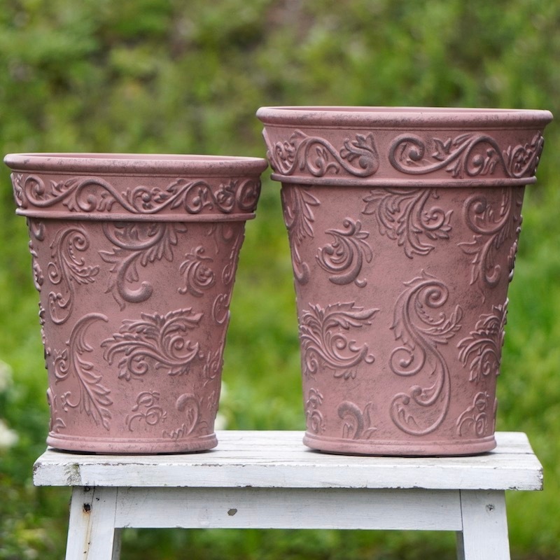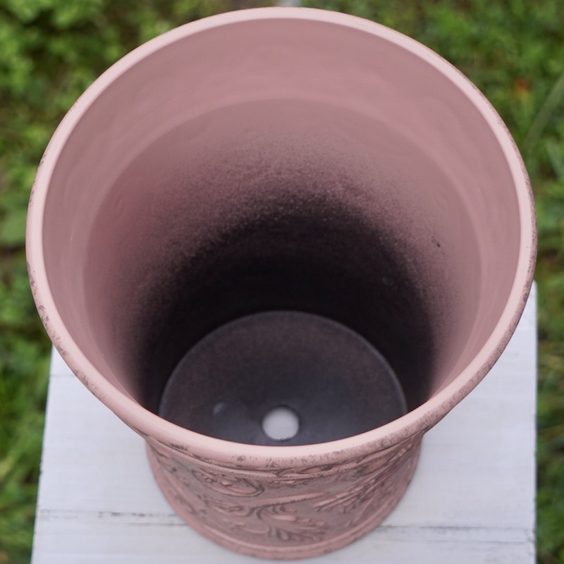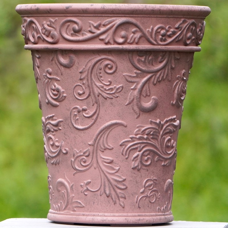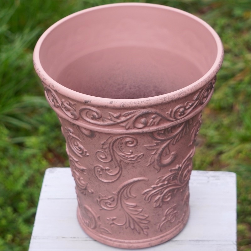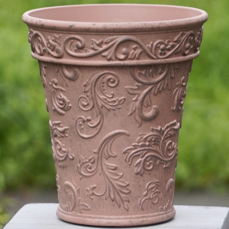ところが、展示会で見ただけでなく、実際に第一弾で入荷したこの樹脂製品をじっくり見て触ってみて、改めてその素材、品質の虜に。 高級感・立体感のあるクラシックなデザインで品質もバッチリ。 価格も激安ではありませんが、お求めやすい。 普通の安価なプラスティック鉢はホームセンターにたくさん並んでいても、こんな素敵なデザインの良質な樹脂製の鉢って置いてる? 欲しくても売ってるお店が近くにないんじゃない!? だったら、ハンギングに拘らず、普通の鉢のバリエーションとしてシリーズで取り扱おうーとなりました^_-☆