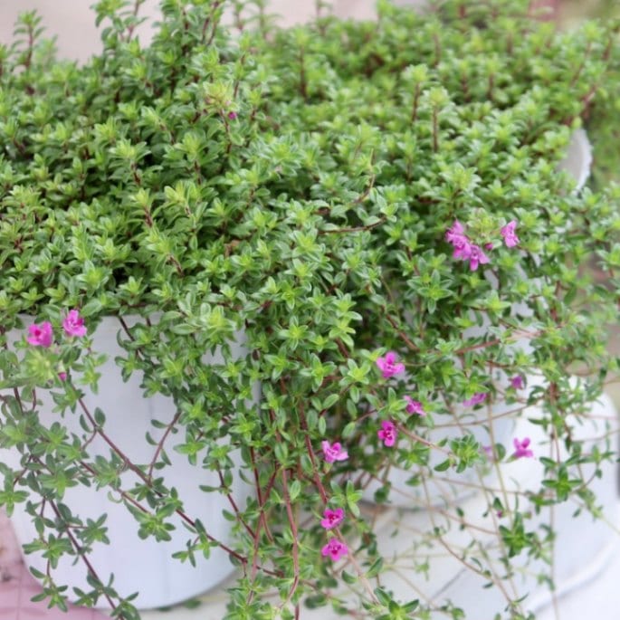5/12 まだ開花していない株もありますが、販売在庫を追加しました!! 最新の入荷株の状態は Instagramの動画アップをお待ちください♪ クリーピングタイムの赤花タイプが入荷しました。 もちろん、花は一時のものなので、基本は葉が魅力のタイムですが。 とろんと垂れ下がるこの可愛さは、寄せ植えの前面やハンギングポット、ブリキポットが似合いますよ(^_-)-☆ もちろん、根元まで美しい良株揃い☆☆☆ タイムの一種。