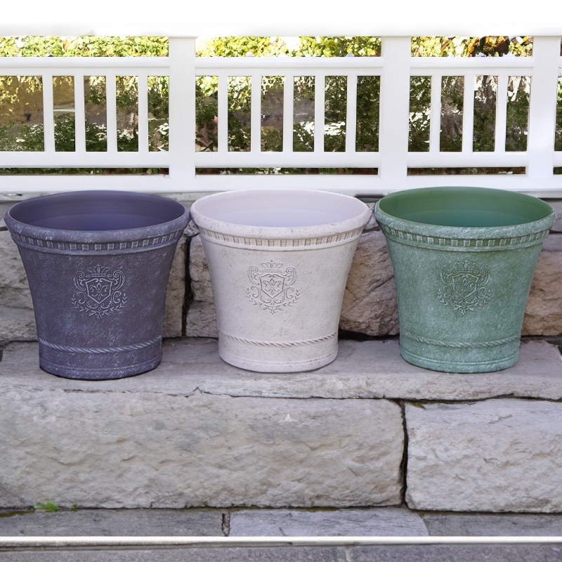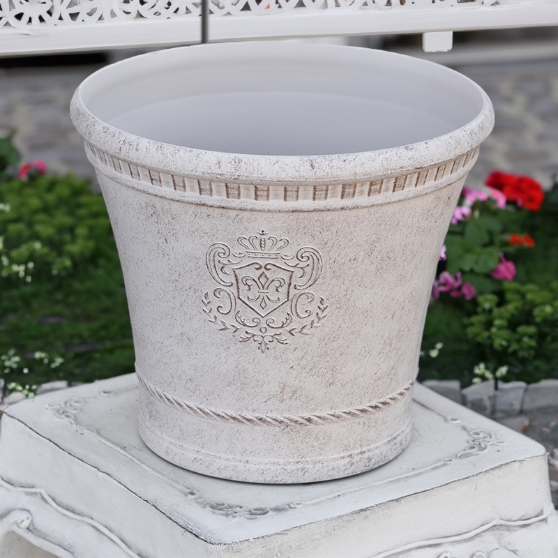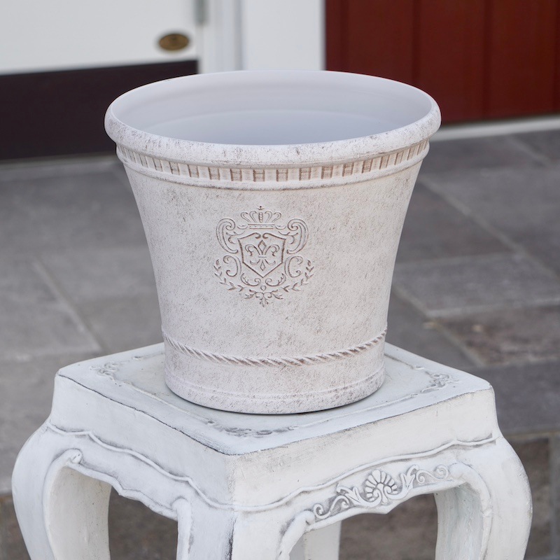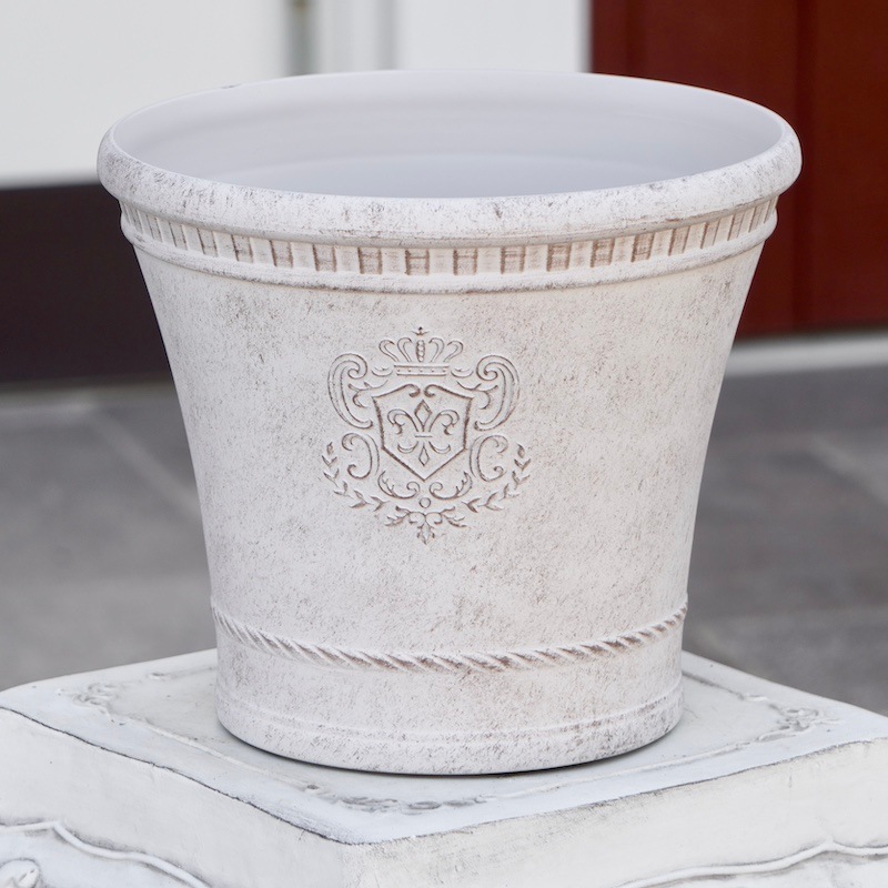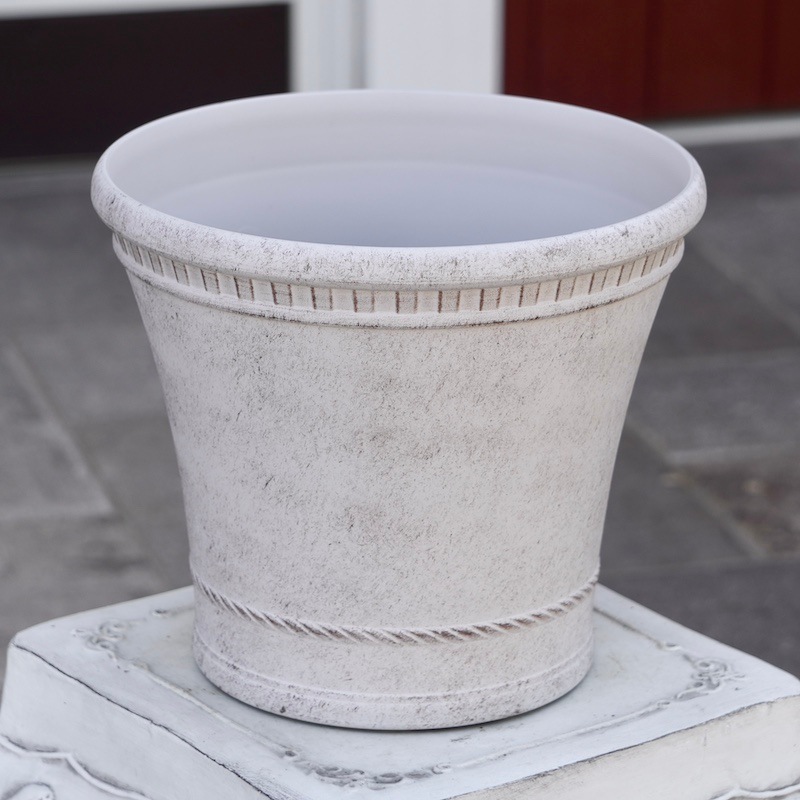 ところが、展示会で見ただけでなく、実際に第一弾で入荷したこの樹脂製品をじっくり見て触ってみて、改めてその素材、品質の虜に。 高級感・立体感のあるクラシックなデザインで品質もバッチリ。 価格も激安ではありませんが、お求めやすい。 普通の安価なプラスティック鉢はホームセンターにたくさん並んでいても、こんな素敵なデザインの良質な樹脂製の鉢って置いてる? 欲しくても売ってるお店が近くにないんじゃない!? だったら、ハンギングに拘らず、普通の鉢のバリエーションとしてシリーズで取り扱おうーとなりました^_-☆