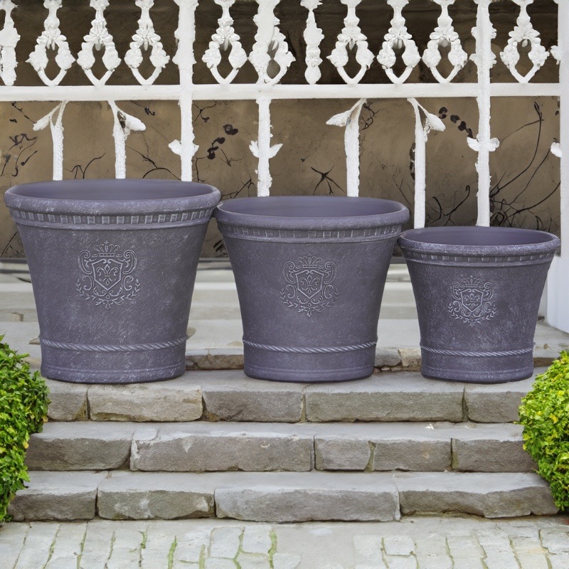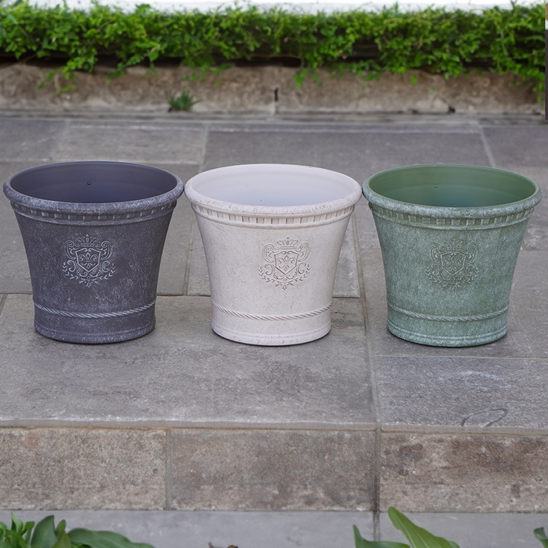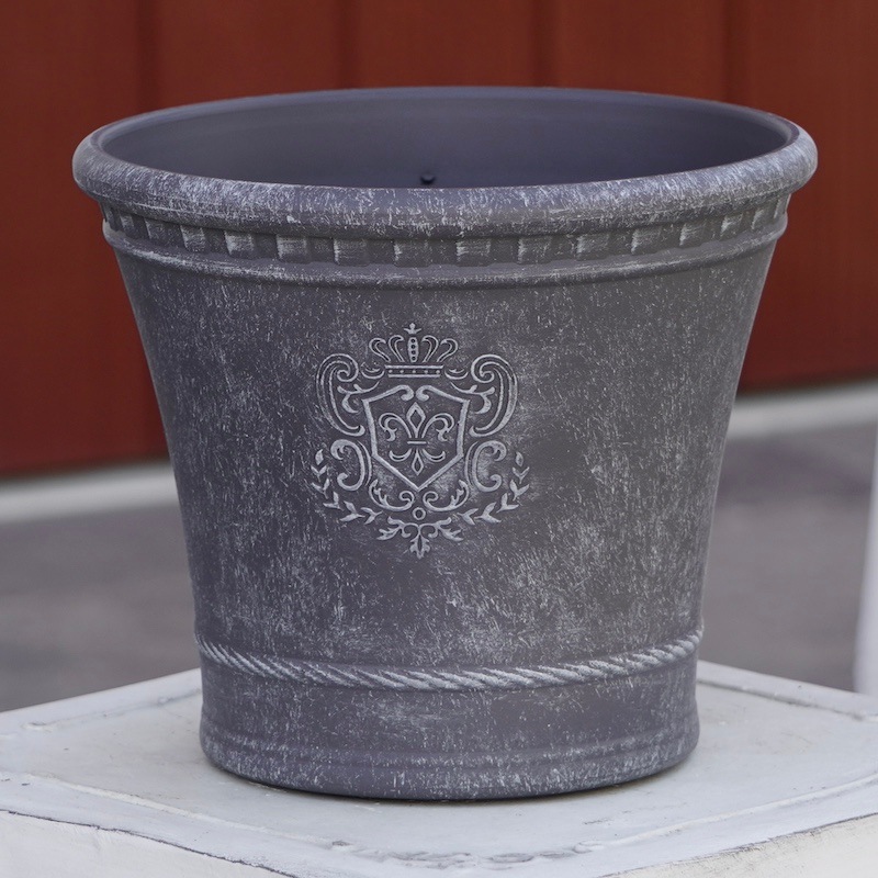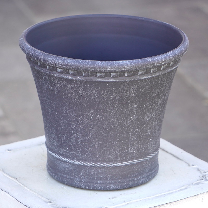 ところが、展示会で見ただけでなく、実際に第一弾で入荷したこの樹脂製品をじっくり見て触ってみて、改めてその素材、品質の虜に。 高級感・立体感のあるクラシックなデザインで品質もバッチリ。 価格も激安ではありませんが、お求めやすい。 普通の安価なプラスティック鉢はホームセンターにたくさん並んでいても、こんな素敵なデザインの良質な樹脂製の鉢って置いてる? 欲しくても売ってるお店が近くにないんじゃない!? だったら、ハンギングに拘らず、普通の鉢のバリエーションとしてシリーズで取り扱おうーとなりました^_-☆
