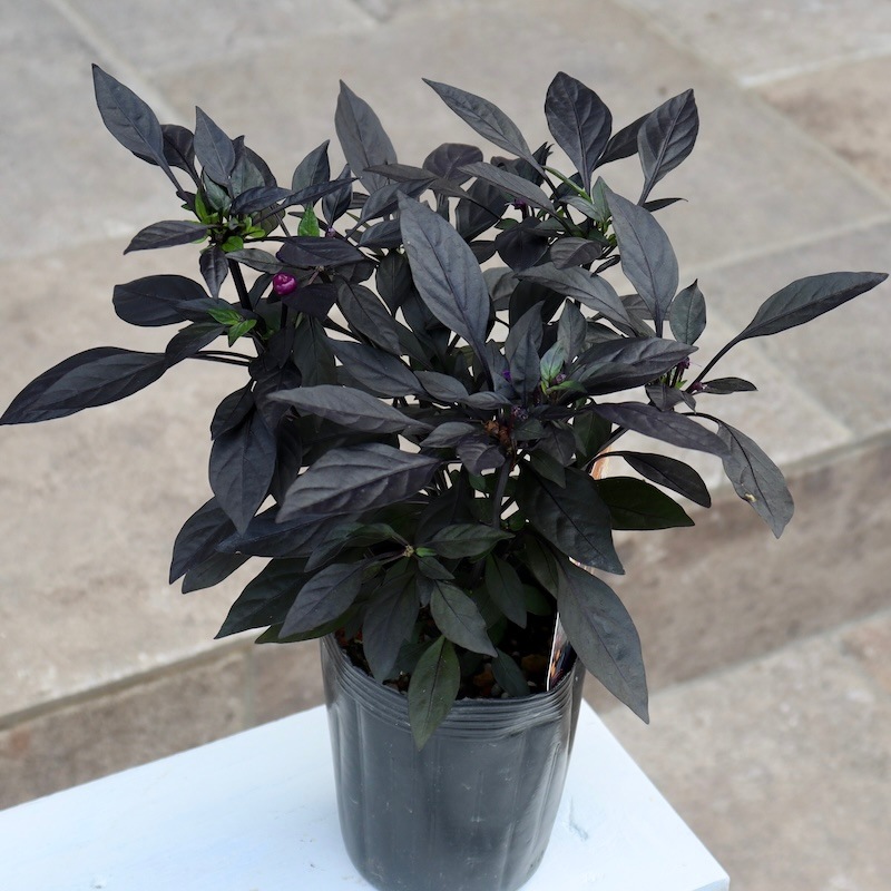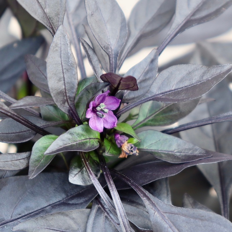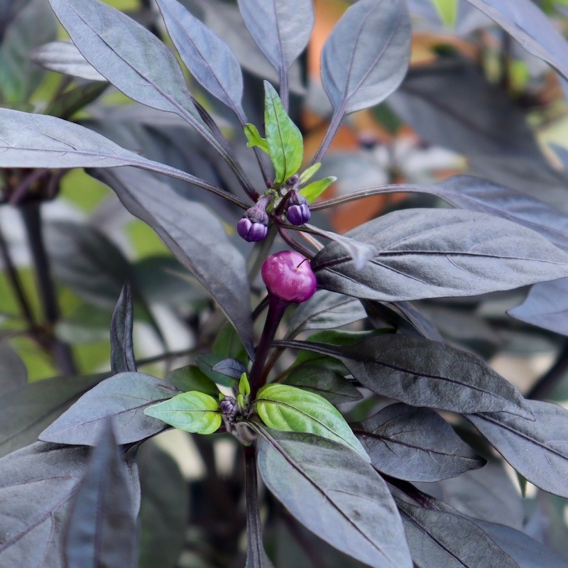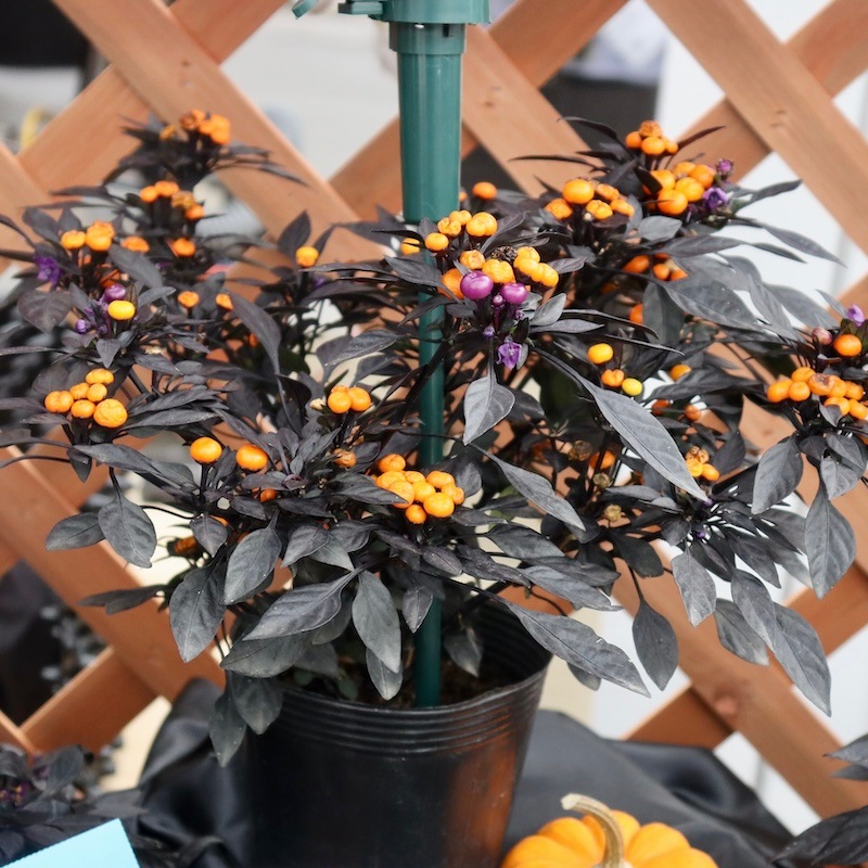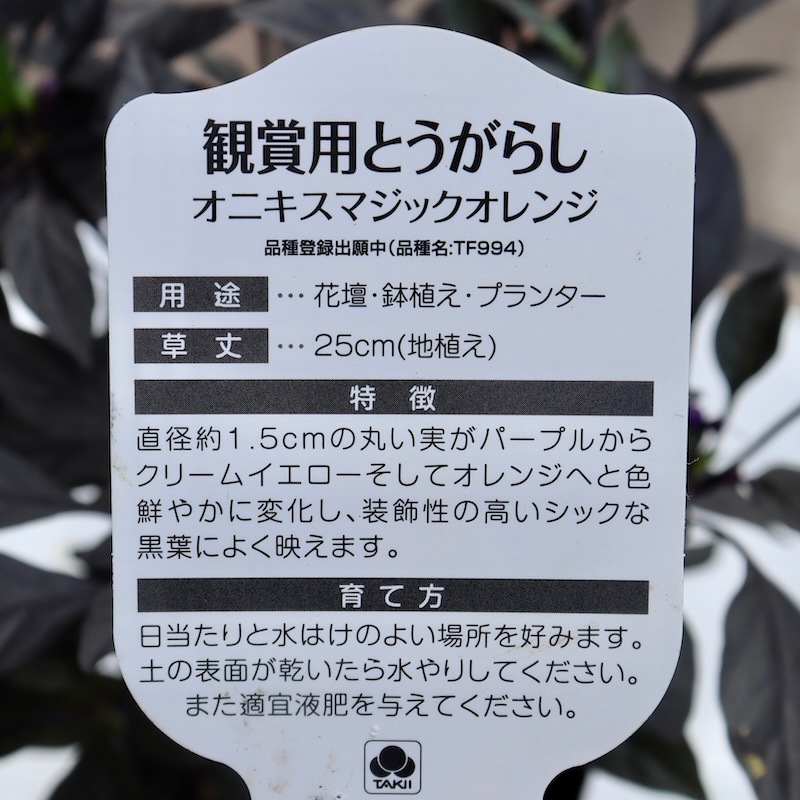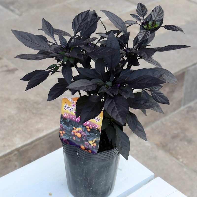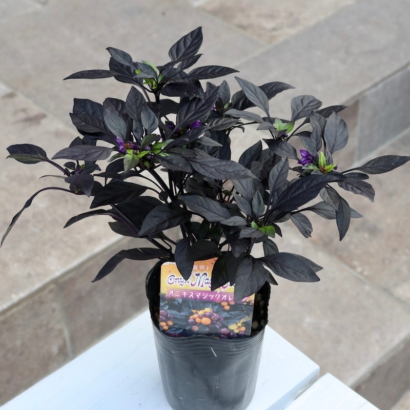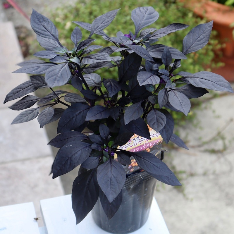 ただ、今回早々に入荷した株は開花しているものの、まだオレンジ色の実はなっていません。 展示会も9月下旬でしたし、その頃にはきっとオレンジの実がたくさん楽しめると思います。 でも、今年の新品種なのでその頃まで待っていると今年は流通量も少なくて入手できないかも!? ということで、一足早く、まずは黒い葉を楽しんで下さいね。 (黒葉のトウガラシなら他にもありますが、実は先の楽しみに・・・)