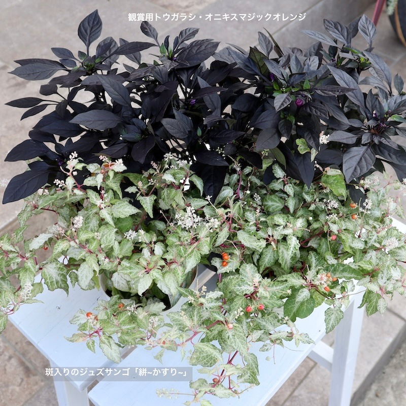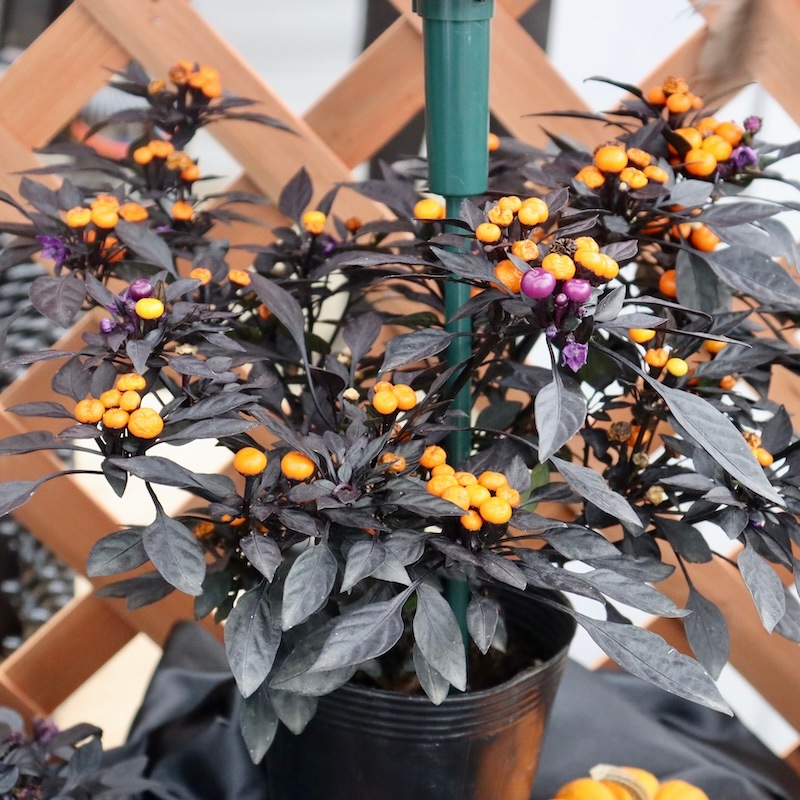 4枚目以降の掲載画像は、2024年8月30日に撮影したものです。 画像の現品もしくは同等品をお届けします。 ハロウィンをイメージしたような・・ 黒葉に丸っこいオレンジ色の実がとっても可愛い2024年の新品種!!
