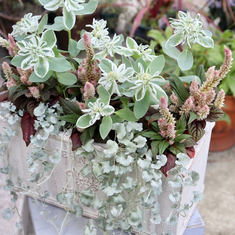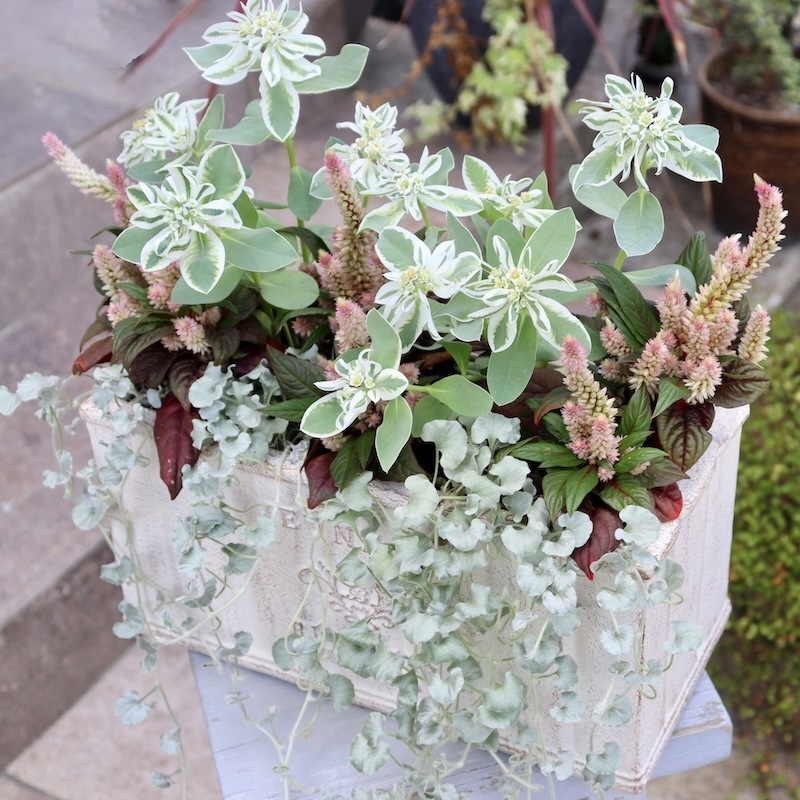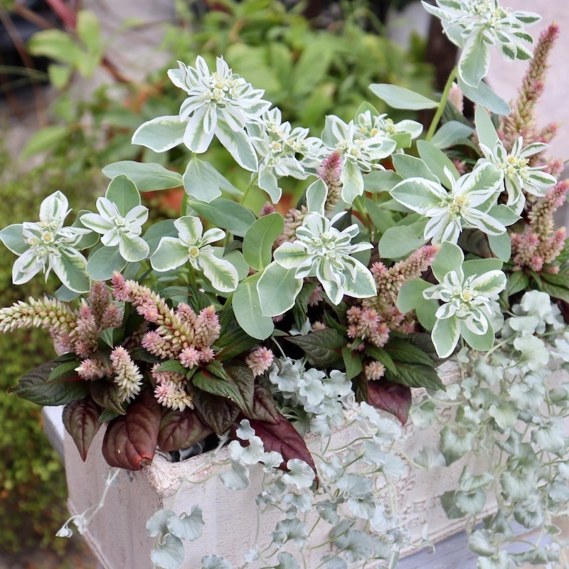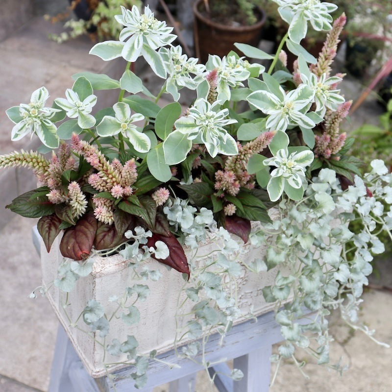 こちら大阪はまだ日中は35℃ いえ、日当たり良好な苗置き場は連日40℃を超えています^^; こんなに暑くても(えっ!?大阪だけ?) 皆さん、寄せ植えがお好き(^_-)-☆ 2024年9月13日に撮影した現品!! お値打ち1点物・見本鉢です☆ 秋ならではの花で寄せ植えしたいけれど、現実には真夏と何も変わらず暑いのでちょっぴり涼しげな寄せ植えにしてみました。笑 実は・・・初入荷の「初雪草」の苗の販売のために作った見本鉢でした。 根付くのを待っていましたが・・・ 「初雪草」の苗は早々に完売^^; 写真を撮って来年のための見本鉢にしますね。 ということで、見本鉢の現品販売です。 水やりぐらいはできるけれど、まだ暑過ぎて植えるのも大変だし、植え傷みしないか心配^^; でも、玄関先や目に付くガーデンコーナーに綺麗な花を飾りたい!! とお考えの方に!!
