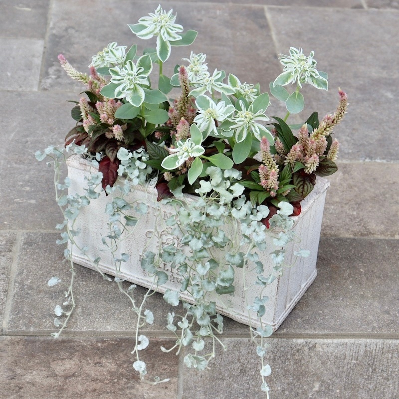 但し、植え込み見本に使用した鉢やバスケットですので、当然汚れたり色あせたりします。ご了承の上でお買い求めください。 (今回の鉢はほぼ新品状態ですが) ★植え込みに使用した鉢★ グラスファイバー・KOシリーズ・プランター(幅29.5)W13599 税込み3190円の鉢です ★植え込んだ植物★ 植物の詳細な説明は苗のページを をご参照くださいね。 *セロシア・スマートルック「ロマンティカ」 495円×3株 *初雪草(ハツユキソウ) 330円×2株 *ディコンドラ・シルバーフォール 495円×2株