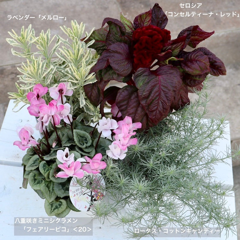 ちょこっと飾ったり、植え替えて育てるのにオススメの株です。 微妙に花色や花弁の形が異なるので、似たものを集めてグループ分けしました。 大差のない色違いもありますが、画像で判断して選んでくださいね。 花粉の出ない八重咲きミニシクラメン。 だから、種ができないので、花もちも良し。そして球根オンリーのため夏越しも簡単です。