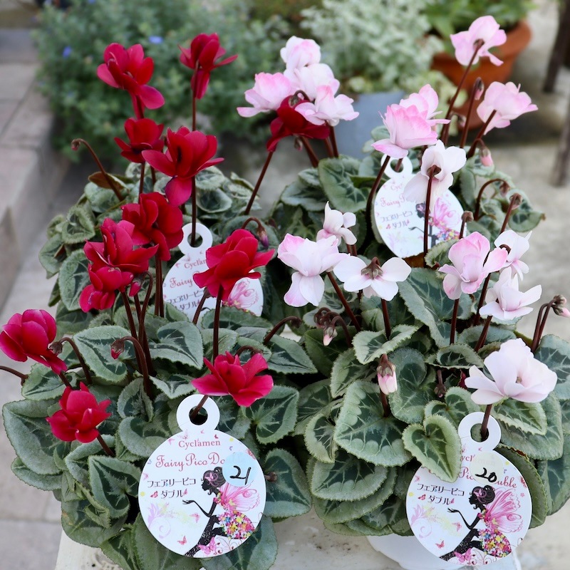 人気の八重咲きミニシクラメン「フェアリーピコ」 この花の丈夫さ、花もちの良さは 感激物ですよ~♪ もちろん、この生産者さんの株だから!!というのも重要ポイトンです。 お手入れも楽々☆ 少し高くはなりましたが、それだけの品質の株なので納得です。 私はこのキュートな花が大好きなんですよね。 だから、5号鉢仕立ての大きな鉢物しかなかった頃からいつも目をつけていました。